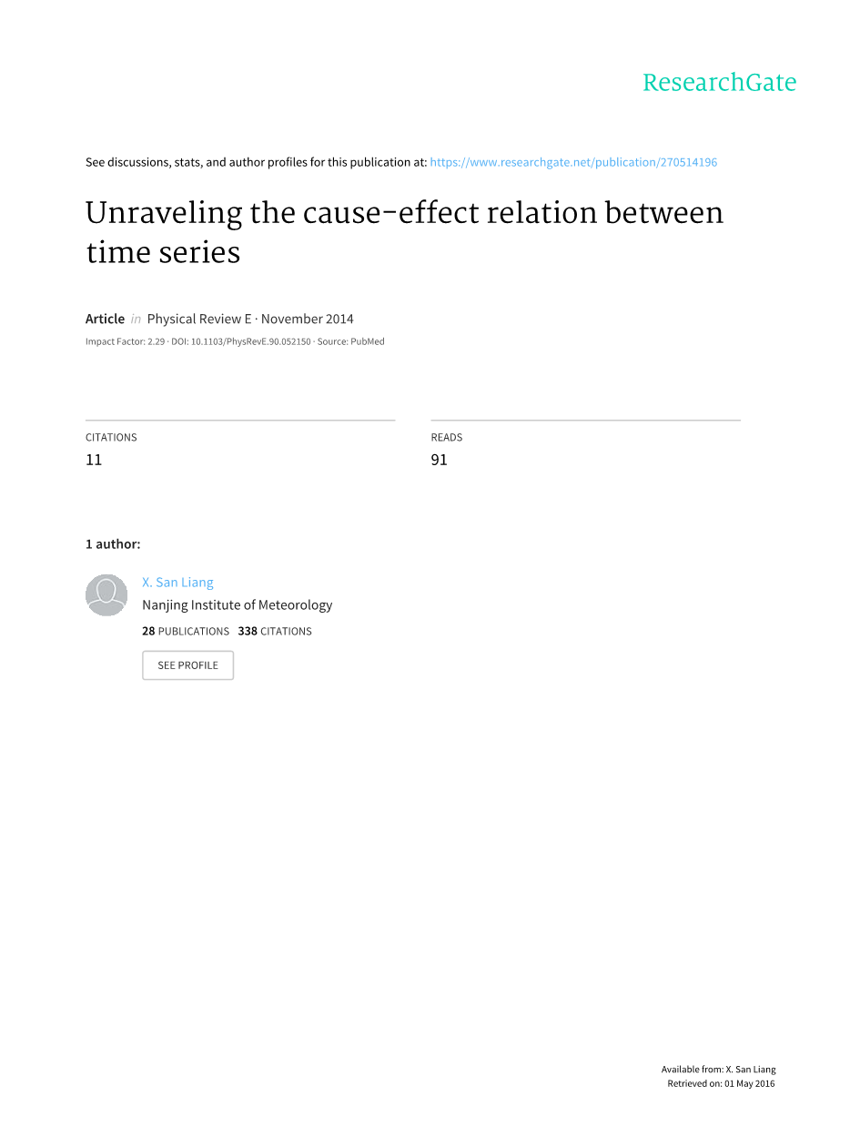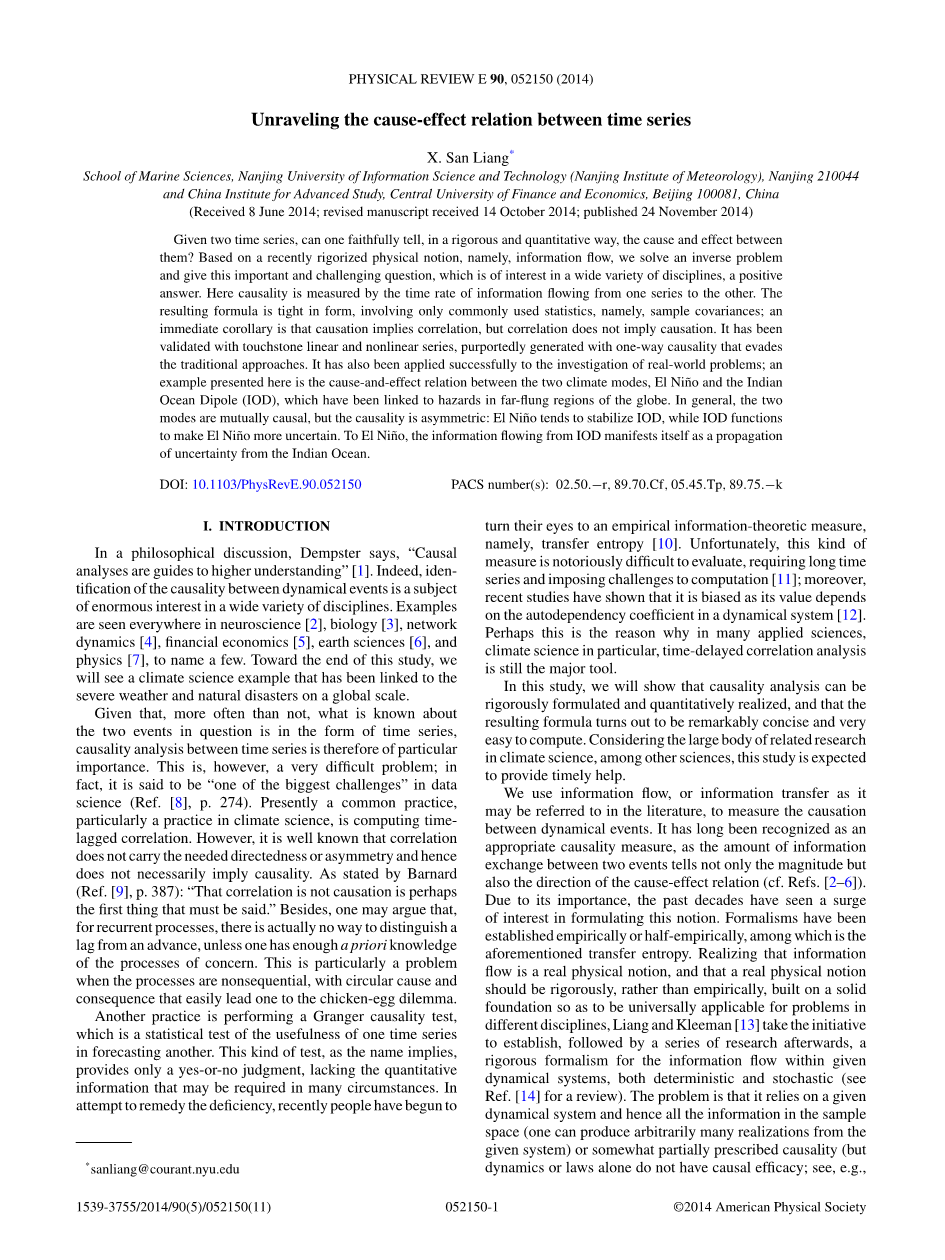 摘要:给定两个时间序列,能否以一种严格和定量的方式表达出他们之间的因果关系?基于最近严格的物理概念,即信息流,我们解决一个反问题,并给出这个重要和具有挑战性的问题,这个问题的答案能广泛应用于各种学科。这里的因果关系通过从一个系列到另一个系列的信息的时间速率来测量。所得公式在形式上是紧密的,仅涉及常用的统计量,即样本协方差;一个直接推论是因果关系意味着相关性,但相关性并不意味着因果关系。它已经被验证与测试线性和非线性系列,据称是生成的单向因果关系,非传统的方法。它也已成功应用于现实世界问题的调查;这里提出的一个例子是两种气候模式(El Nino和印度洋偶极子(IOD))之间的因果关系,它们与全球广泛地区的气象灾害有关。一般来说,两种模式是互为因果的,但因果关系是不对称的:El Nino倾向于稳定IOD,而IOD则使El Nino更不确定。对于厄尔尼诺,来自IOD的信息表现为来自印度洋的不确定性的传播。