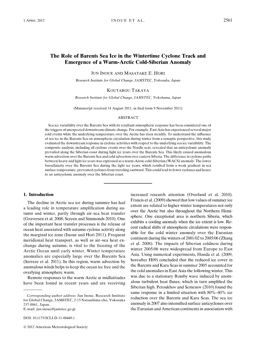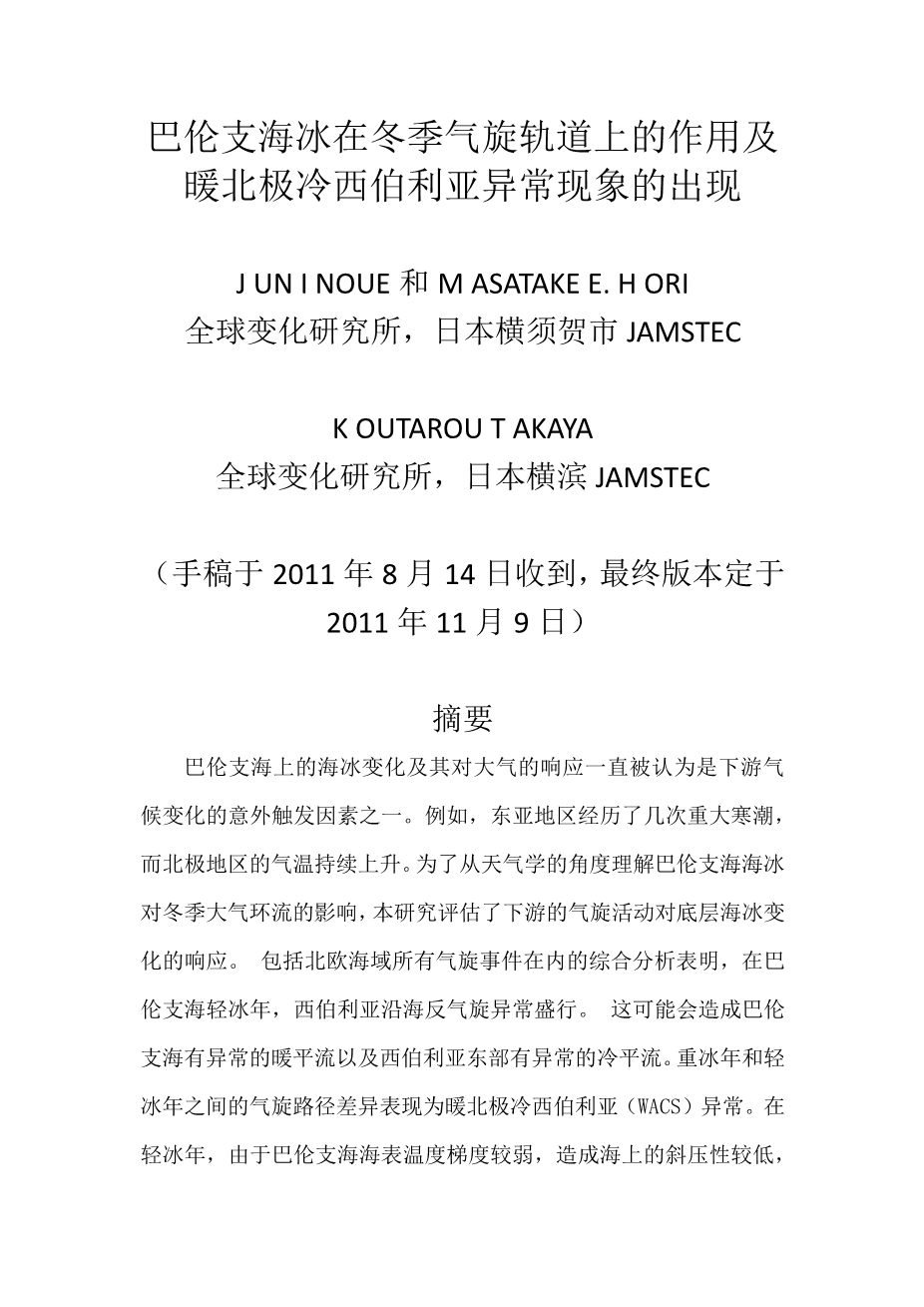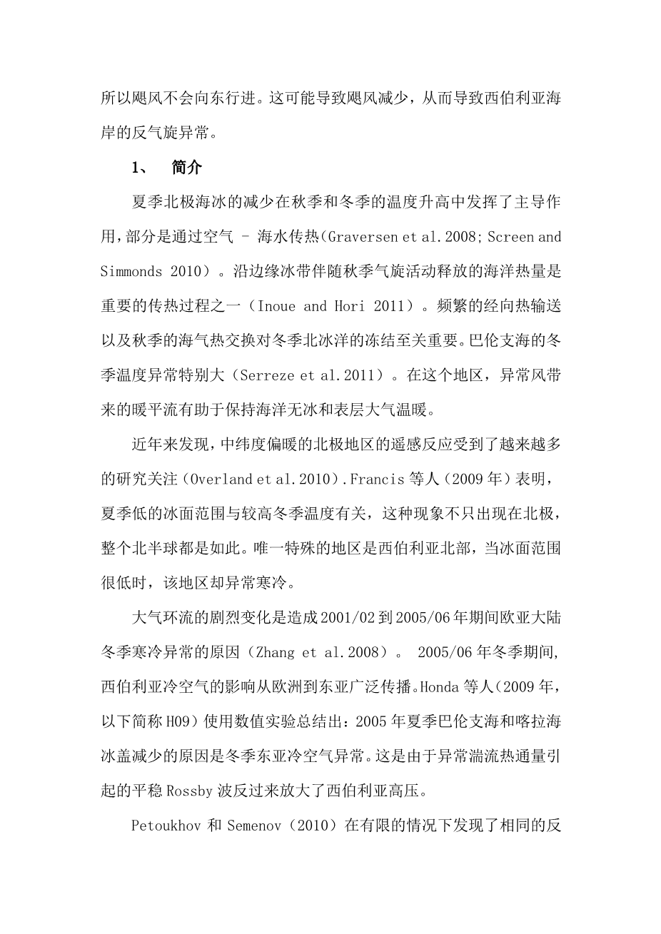 巴伦支海冰在冬季气旋轨道上的作用及暖北极冷西伯利亚异常现象的出现,外文翻译资料