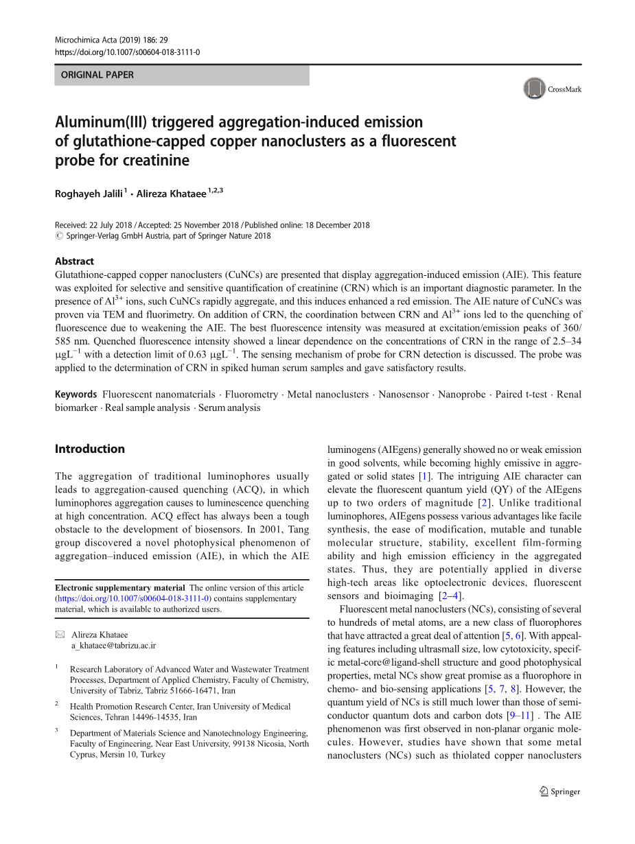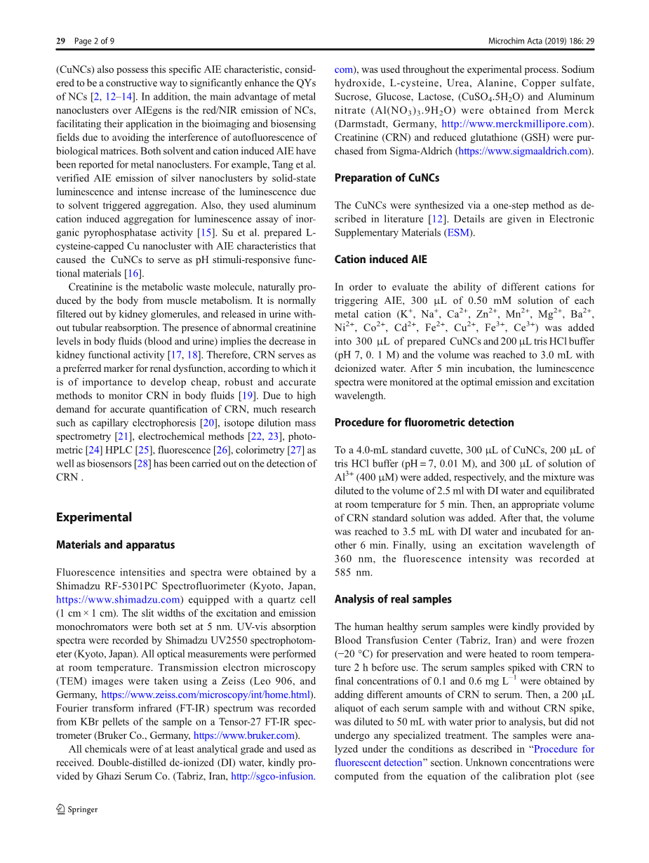 Al3 引发谷胱甘肽封端的铜纳米团簇的聚集诱导效应及其作为肌酐的荧光探针的应用研究