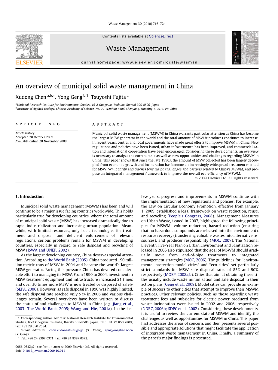 作为最大的发展中国家,中国尤其需要关注。根据世界银行(2005)所提供的信息,中国在2004年产生了1.9亿吨城市生活垃圾,成为了世界上最大的城市生活垃圾产生者。面临现状的压力,中国一直非常致力于城市生活垃圾的治理。从1990年到2004年,城市生活垃圾处理设备和基础设施的投资增长了21倍,其安全处理或处置的城市生活垃圾超过原来30倍以上(SEPA,2006)。然而,在1990年,由于当时的安全处置非常有限,其效率只有2006年的53%,因此遗留了各种艰巨的挑战。现有数篇文献综述探讨了中国城市生活垃圾治理的状况和挑战(例如Jiang等,2003;世界银行,2005;Wang和Nie,2001a)。在过去的数年间,伴随新法规政策的实施,城市生活垃圾治理不断取得进步与提升。例如,从2009年1月1日起生效的循环经济促进法建立了关于垃圾减少、再利用、再循环的法律框架(人民代表大会,2008)。2007年发布的城市生活垃圾管理办法强调了如下原则:减量化、无害化(确保没有危险化合物进入到环境中)、资源化(将有剩余价值的废弃物转化为具替代性的资源)和谁产生、谁依法负责(建设部,2007)。2006年发布的全国城镇环境卫生“十一五”规划也规定城市生活垃圾治理目标应逐渐从过程末端治理转变到综合治理(建设部,2006)。“环保模范城市”和“生态城市”的相关指导方针要求两者的城市生活垃圾安全处置率必须分别达到85%和90%(环保部,2008a,b)。想要获得相应称号的城市通常要有垃圾减量化与无害化的行动规划(Geng等,2008)。模范城市可以给其它城市提供关于提升城市生活垃圾治理实践的成功经验。其它相关政策,例这些涉及可再生能源发电价格和费用管理的条例分别在2002年和2006年得到颁布((NDRC,2006b;SDPC等,2002)。考虑到这些发展,回顾中国城市生活垃圾治理的现状并确定其挑战与机遇是非常有用的。本文首先提出了该方面涉及的内容,接着介绍了几种可行且适合的、便于在中国实行的垃圾综合治理解决方案。最后,对文章的主要研究成果进行了总结。