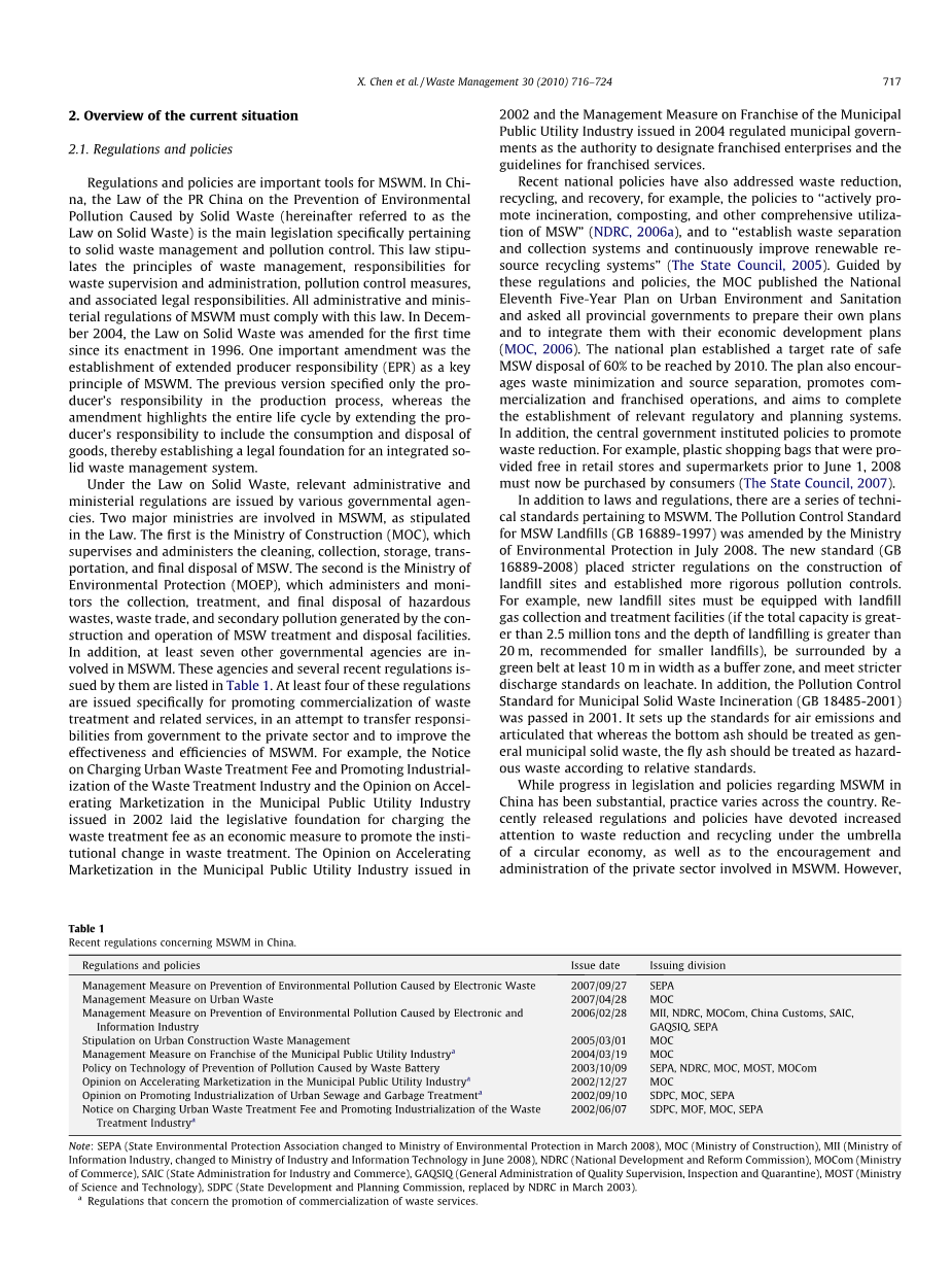 根据固废法,相关行政主管部门规章由不同的政府部门发布。两大部委参与了城市生活垃圾治理法律的制定。第一个是建设部(MOC),负责监管城市生活垃圾的清扫、收集、贮存、运输和最终处置。另一个则是环保部(MOEP),负责监管危险废物、废物贸易以及城市生活垃圾处理处置设施的建设与运行中产生的二次污染物的收集、处理和最终处置。此外,另有超过7个国家部门涉及城市生活垃圾的治理。这些部门及其近期发布的若干规章见表1。其中至少4项法规是专门为促进废物处理及相关服务的商业化而发布的,其目的在于将责任中心由政府迁移至私营部门,以此提高城市生活垃圾治理的效用与效率。例如,2002年发布的《关于实行 城市生活垃圾处理收费制度促进垃圾处理产业化的通知》和《关于加快市政公用行业市场化进程的意见》通过立法将垃圾处理收费作为一种经济手段,以此促进整个垃圾处理行业的转型。《关于加快市政公用行业市场化进程的意见》(2002)和《市政公用事业特许经营管理办法》(2004)规定政府有权指定特许企业及特许服务准则。近期国家政策也涉及了垃圾的减量化、再循环和回收利用,例如,“积极推进城市生活垃圾的焚烧、堆肥及其它综合利用”的政策和“建立垃圾分类与收集系统及不断完善再生资源回收系统”的政策(国务院,2005)。通过这些法规政策,建设部公布了全国城镇环境卫生“十一五”规划并要求各省级政府起草相应规划并将其整合入经济发展规划(建设部,2006)。国家计划确立了城市生活垃圾安全处置率到2016年达到60%的目标值。该计划还鼓励垃圾减量化与源头分类,推进商业化与特许经营,旨在完成相关法规和规划体系的建立。此外,中央政府通过制定政策以促进垃圾的减量化。例如,零售商店和超市之前供应的免费塑料袋在2008年6月1日后需要消费者花钱购买(国务院,2007)。