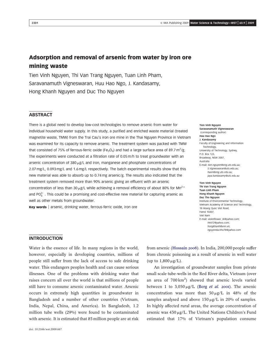 本次研究采用从越南太原省Trai Caursquo;铁矿开采中产生的一种磁铁矿废料(TMW),将其提纯和浓缩后,研究其对越南地下水和实验室合成砷废水的除砷能力。使用这种矿物作为吸附剂,不仅来源广泛,而且成本较低。