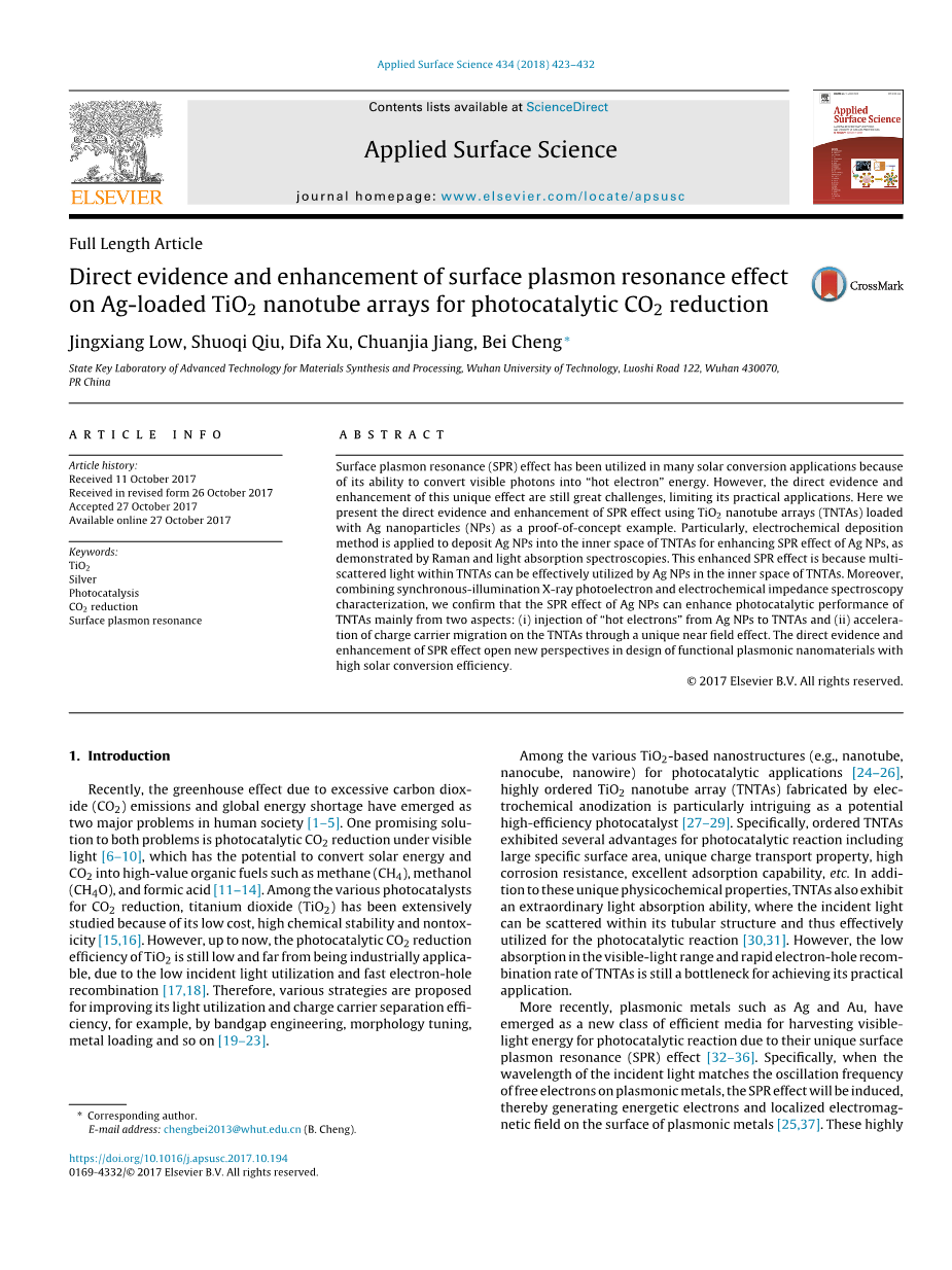 直接证据和增强表面等离子共振效应 用于光催化CO2 还原的载银TiO2 纳米管阵列