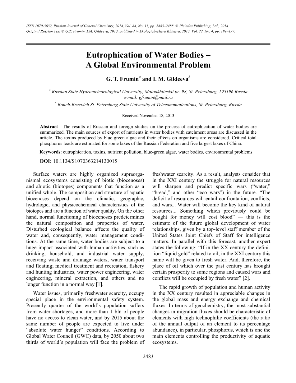 摘要:本文比较了国内外关于水体富营养化过程研究报告包括蓝绿藻产生的毒素对生物体的影响,讨论了富营养化水体中主要污染物质及其富集途径。据此,估计出俄罗斯某些湖泊和中国五大淡水湖的临界总磷负荷。