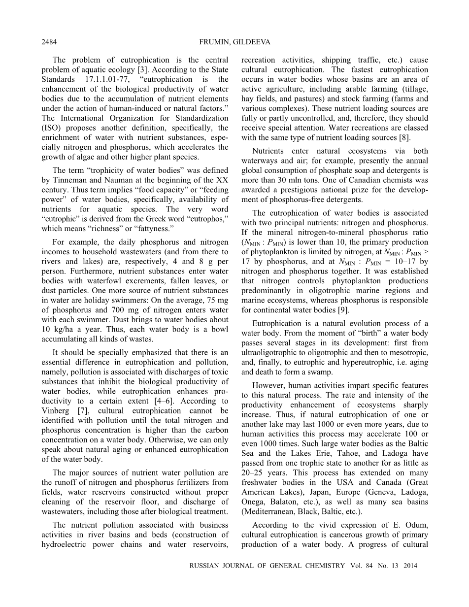 对输入到水体中的磷与后者的营养水平之间的关系的研究导致所谓的营养负荷概念的发展,其基于具有定量磷输入 - 水体响应相关性的想法。结果,水体改变其在营养级的位置。 Vollenweider 提出了磷负荷(LCP,(g)Р(m-2 year-1)),允许水体保持在营养状态,使用水体的平均深度(Lambda;av,m)标准参数:LCP =0.025Нav0.6。由上述公式计算的结果示于表1和2中。