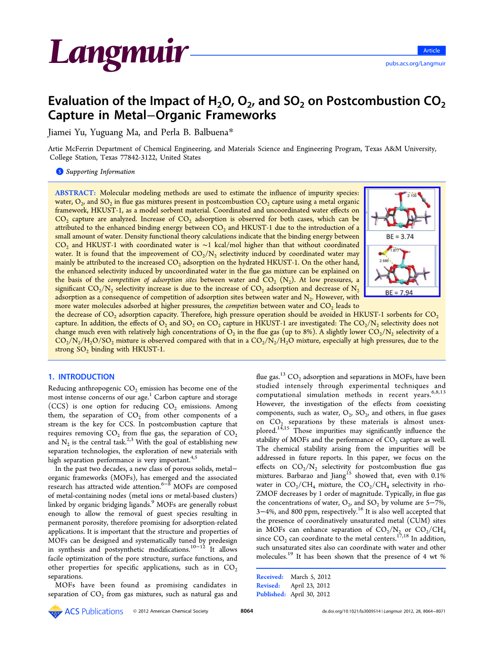 在这项工作中,分子建模方法被用来评估这些共存物种对HKUST-1中CO2的捕集的影响,一个框架中的里程碑MOF模型。据报道,观察活化后的配位水分子的去除只有很小的结构变化。此外,活性材料HKUST-1水稳定性也得到了几组研究。观察没有改变的PXRD模式的HKUST-1 ,被激活的HKUST-1暴露在空气中24h(相对湿度18%)。我们进行了系统的探讨,主要是为了了解水对HKUST-1的CO2分离性能的影响。此外,第一次对在MOFs分离CO2中烟气中的氧气和二氧化硫对其影响的检查。