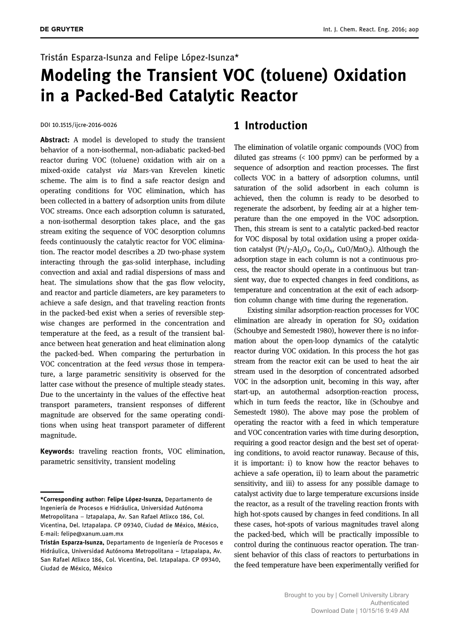可通过一系列吸附和反应过程从低浓度气(lt;100 ppmv)中消除挥发性有机化合物(VOC)。首先将VOC收集在一组吸附塔中,直到每个吸附塔中的固体吸附剂达到饱和为止,然后通入高于VOC吸收塔温度的空气,准备解吸以再生吸附剂。然后,将该气流送入催化填料床反应器中,使用适当的氧化催化剂(Pt /gamma;-Al2O3,Co3O4,CuO/ MnO 2)对VOC进行处理。尽管每个塔中的吸附阶段不是一个连续的过程,但由于进料条件的预期变化,反应器应以连续但短暂的方式运行,因为再生过程中每个吸附塔出口处的温度和浓度会随时间而变化。