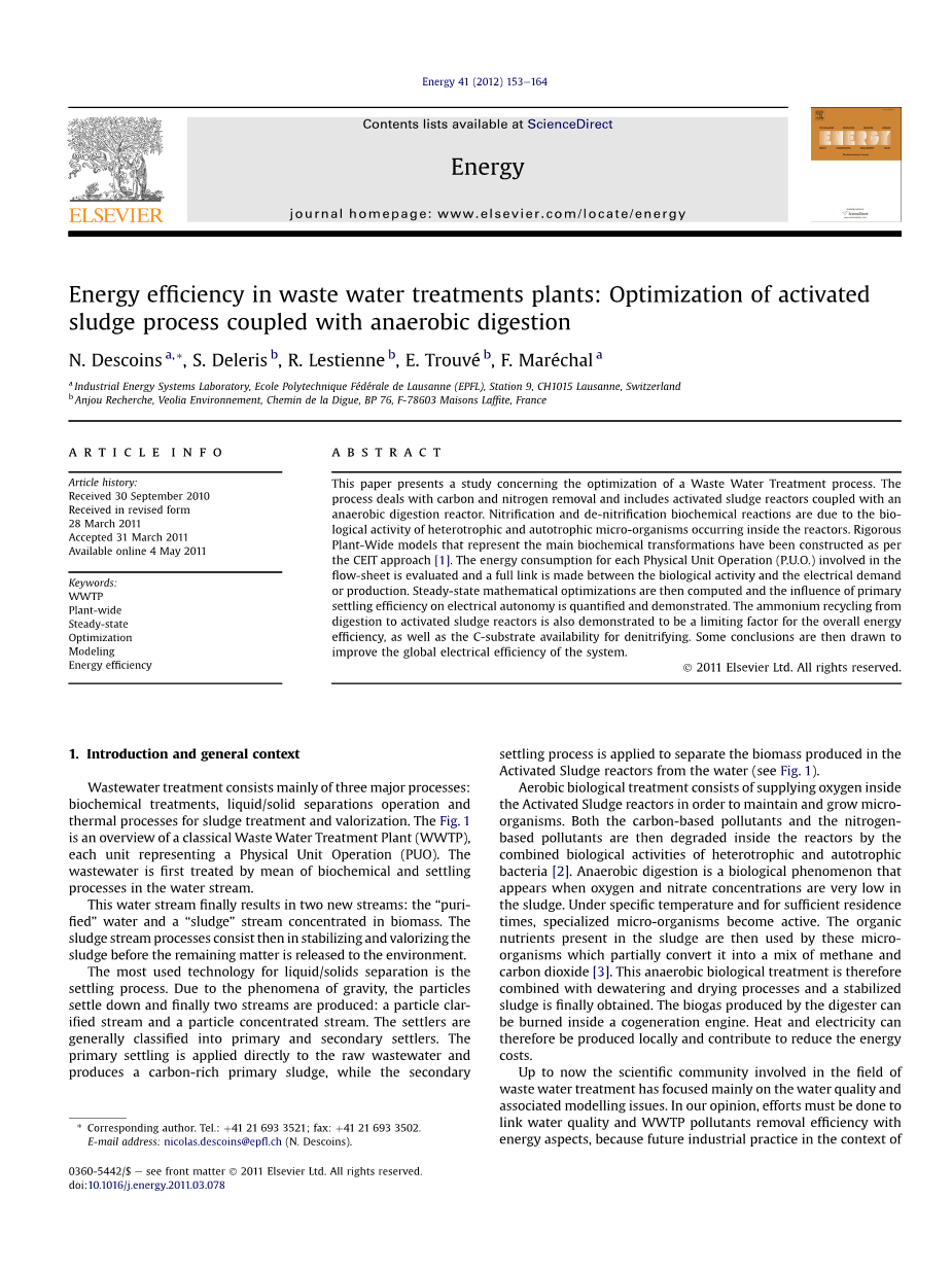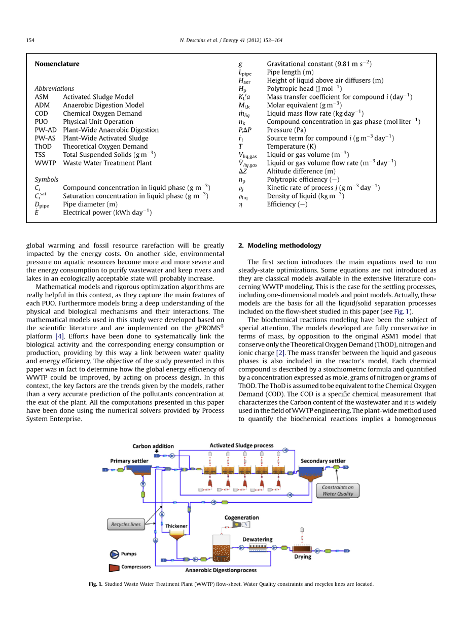 好氧生物处理包括在活性污泥反应器内供氧以维持和培养微生物。利用异养菌和自养菌[2]的生物活性,在反应器内降解碳基污染物和氮基污染物。厌氧消化是污泥中氧和硝酸盐浓度很低时出现的一种生物处理过程。在特定的温度和足够的停留时间下,特定的微生物开始活跃。污泥中的有机营养物质被这些微生物利用,这些微生物将其部分转化为甲烷和二氧化碳的混合物。因此,将厌氧生物处理与脱水干燥工艺相结合,最终得到稳定的污泥。同时沼气池产生的沼气可以在热电联产发动机中燃烧。因此,热能和电能可以就地产生,有助于降低能源成本。到目前为止科学界参与废水处理领域主要集中在相关的水质和建模问题。我们认为,必须努力将水质和污水处理厂污染物去除效率与能源方面联系起来,因为在全球变暖和化石资源稀缺的背景下,未来的工业实践将受到能源成本的巨大影响。另一方面,水资源对环境的压力越来越大,净化废水和保持河流湖泊处于生态可接受状态的能耗可能会增加。