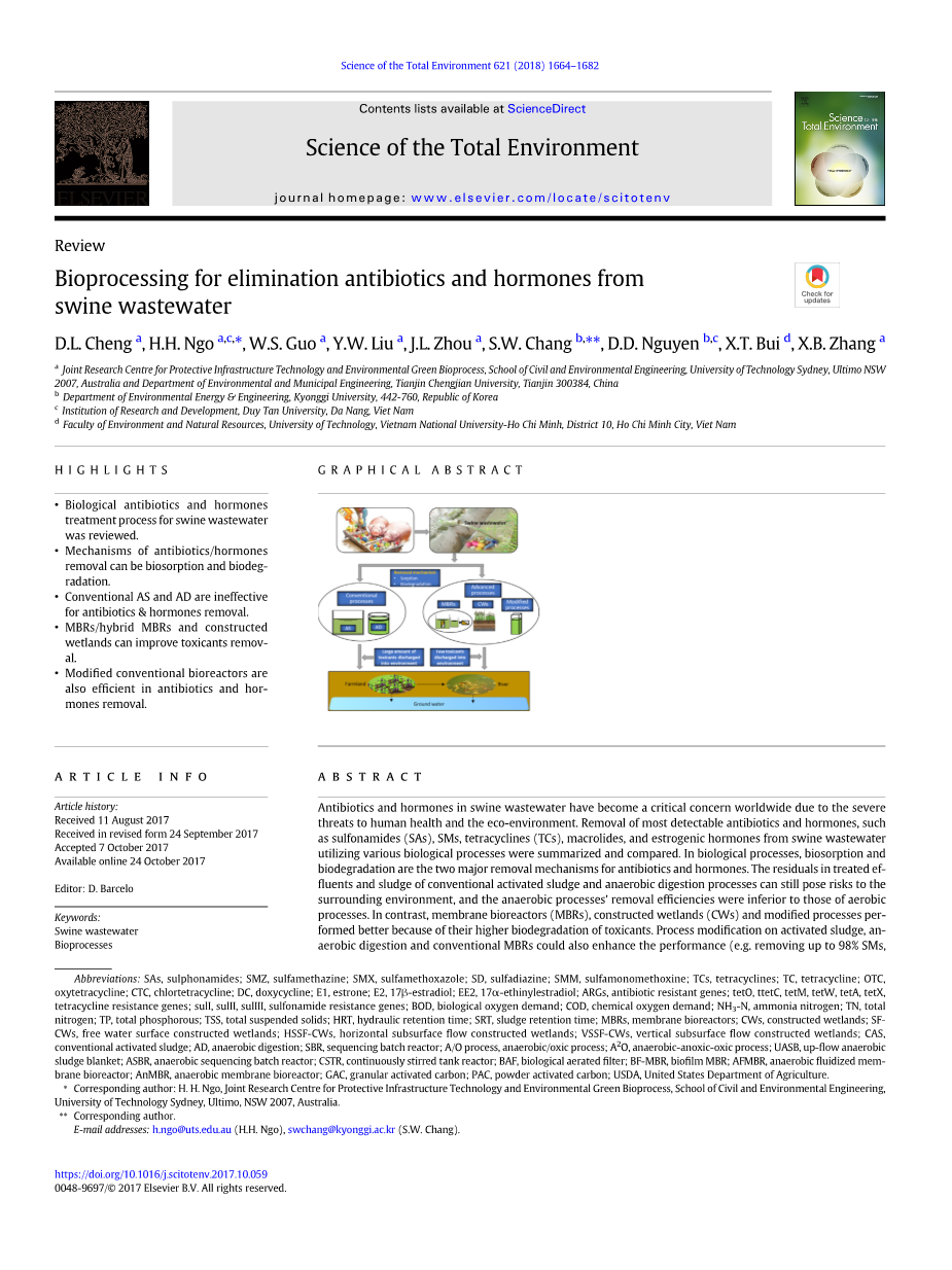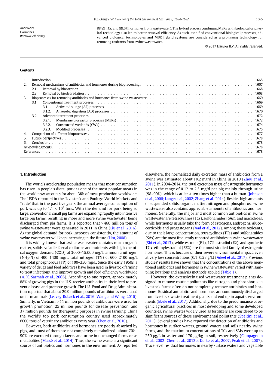 关键词:猪废水;生物过程;抗生素;激素;去除效率
