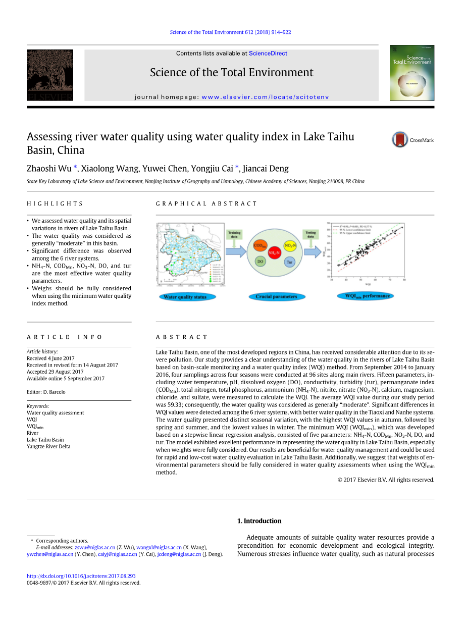 关键词:水质评价 水质指数 WQImin 河 太湖流域 长江三角洲