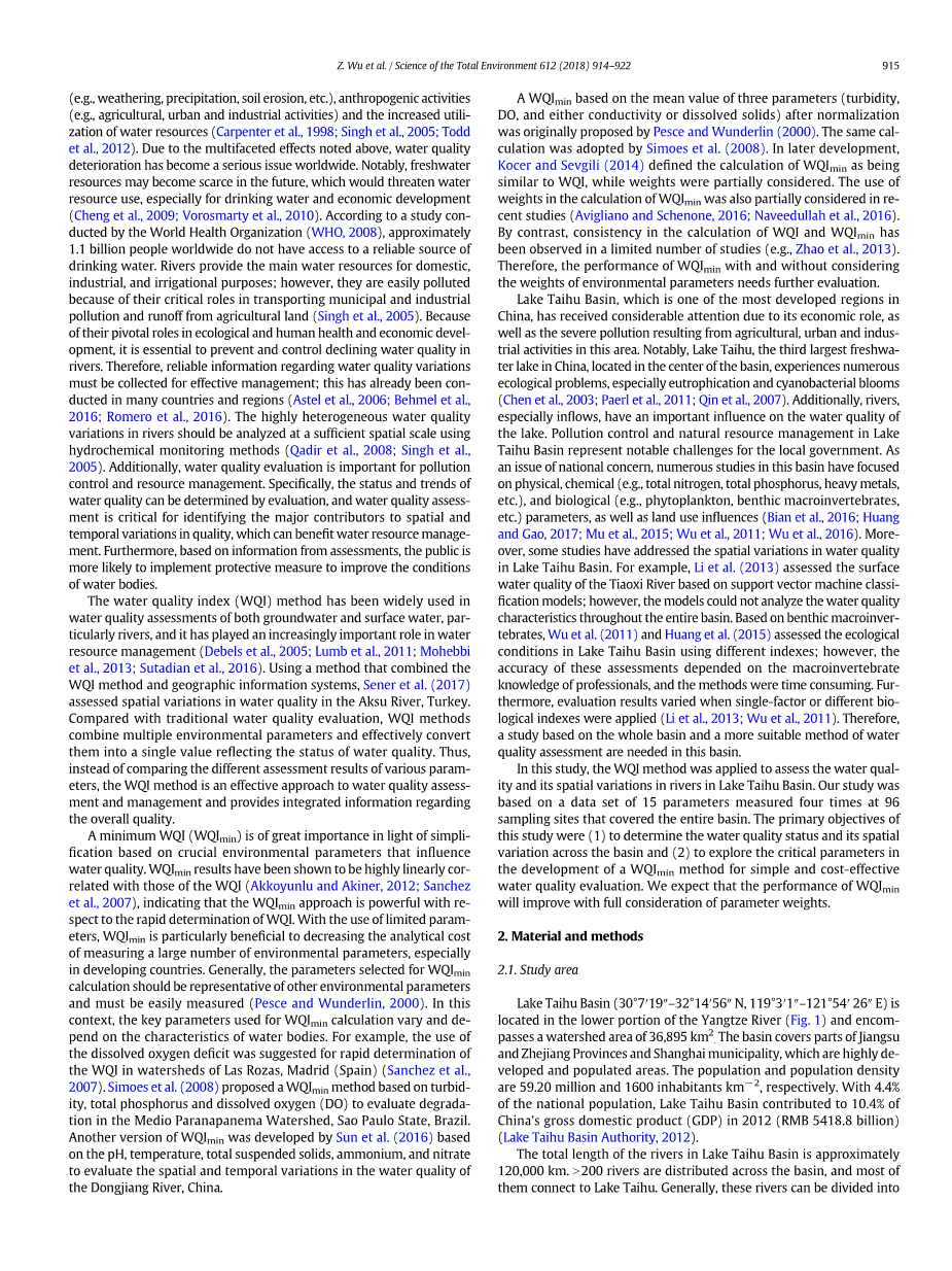 WQI最小值(WQImin)在基于影响水质的关键环境参数的简化中具有重要的意义。WQImin的结果与WQI的结果呈高度线性相关(Akkoyunlu and Akiner, 2012; Sanchez et al., 2007),表明WQImin方法在使用有限参数的情况下对WQI的快速测定具有强大的作用。在使用有限的参数时,WQImin特别有利于降低测量大量环境参数的分析成本,特别是在发展中国家。一般情况下,选择的WQImin计算参数应具有其他环境参数的代表性,且必须易于测量。(Pesce and Wunderlin, 2000)。在此背景下,WQI计算所用的关键参数各不相同,主要用于水体的特性。例如,在Las Rozas的流域内,利用溶解氧不足的方法快速测定WQI。Madrid (Spain) (Sanchez et al.,2007)。Simoes等人(2008)提出了基于浊度、总磷和溶解氧(DO)的WQImin方法,用于评价巴西Sao Paulo州Medio Paranapanema流域的退化。WQImin的另一个版本是由Sun等人.(2016)开发的,基于pH、温度、总悬浮固体、铵和硝酸盐来评价中国东江水质的时空变化。WQImin基于三个参数的平均值(浊度,DO,或电导率或溶解固体)的平均值,最初由Pesce and Wunderlin(2000)提出。Simoes等人(2008)也采用了同样的计算方法。在后来的发展中,Kocer和Sevgili(2014)将WQImin的计算定义为与WQI类似,而权重则被部分考虑。对WQImin计算中权重的使用也在最近的研究中得到了部分考虑(Avigliano和Schenone, 2016;Naveedullah et al .,2016)。相比之下,WQI和WQImin计算的一致性在有限的研究中得到了观察(如Zhao et al., 2013)。因此,WQImin的性能和不考虑环境参数的权重需要进一步的评价。太湖流域是中国最发达的地区之一,由于其经济作用和农业、城市和工业活动造成的严重污染,已引起了相当多的关注。值得一提的是,中国第三大淡水湖太湖位于流域中心,经历了许多生态问题,特别是富营养化和蓝藻华(Chen et al.,2003;Paerl et al .,2011;Qin et al .,2007)。此外,河流,特别是流入的河流,对湖泊水质有重要影响。太湖流域污染控制和自然资源管理是地方政府面临的重大挑战。作为一个国家关注的问题,这一流域的许多研究都集中在物理、化学(例如,总氮、总磷、重金属等)和生物(如浮游植物、底栖大无脊椎动物等)的参数,以及土地利用的影响(Bian et al., 2016; Huang and Gao, 2017; Mu et al., 2015; Wu et al., 2011; Wu et al., 2016)。此外,对太湖流域水质的空间变化进行了研究。例如,Li et al.(2013)通过支持向量机分类模型对Tiaoxi河的地表水水质进行了评估,但是,这些模型无法分析整个流域的水质特征。Wu et al.(2011)和Huang et al.(2015)以底栖大无脊椎动物为基础,利用不同的指标对太湖流域生态环境进行了评价;然而,这些评估的准确性依赖于专业人员的宏观无脊椎知识,而它们是耗时的。此外,当应用单一因子或不同的生物指标时,评价结果也会有所不同(Li et al., 2013;Wu et al., 2011)。在此基础上,对整个流域进行了研究,并提出了一种较为适宜的水质评价方法。在本研究中,采用了WQI方法对太湖流域河流水质及其空间变化进行了评价。我们的研究基于15个参数的数据集,在96个采样点上测量了整个盆地的4次。本研究的主要目标是(1)确定整个流域的水质状况及其空间变化(2)探讨WQImin方法发展的关键参数,以进行简单和成本效益的水质评价。我们预计WQImin的性能将在充分考虑参数权重的情况下得到改善。