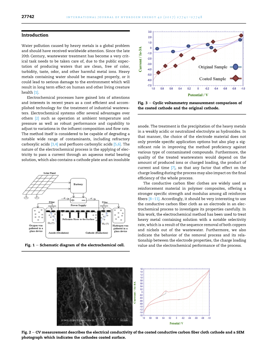 导电炭布被广泛用作高分子复合材料中的加固材料,在所有加固纤维中提供一个更强的强度系数和模量[8-11]。因此,使用导电碳布作为电化学过程中的电极去仔细研究其性能会非常有趣。在这项研究中,电化学方法以一个高选择性被用于处理含重金属的溶液,这是依次去除废水中铜和镍的结果。此外,我们还指出了去除过程的反应表现及其在电极性能间的关系——电荷负载。