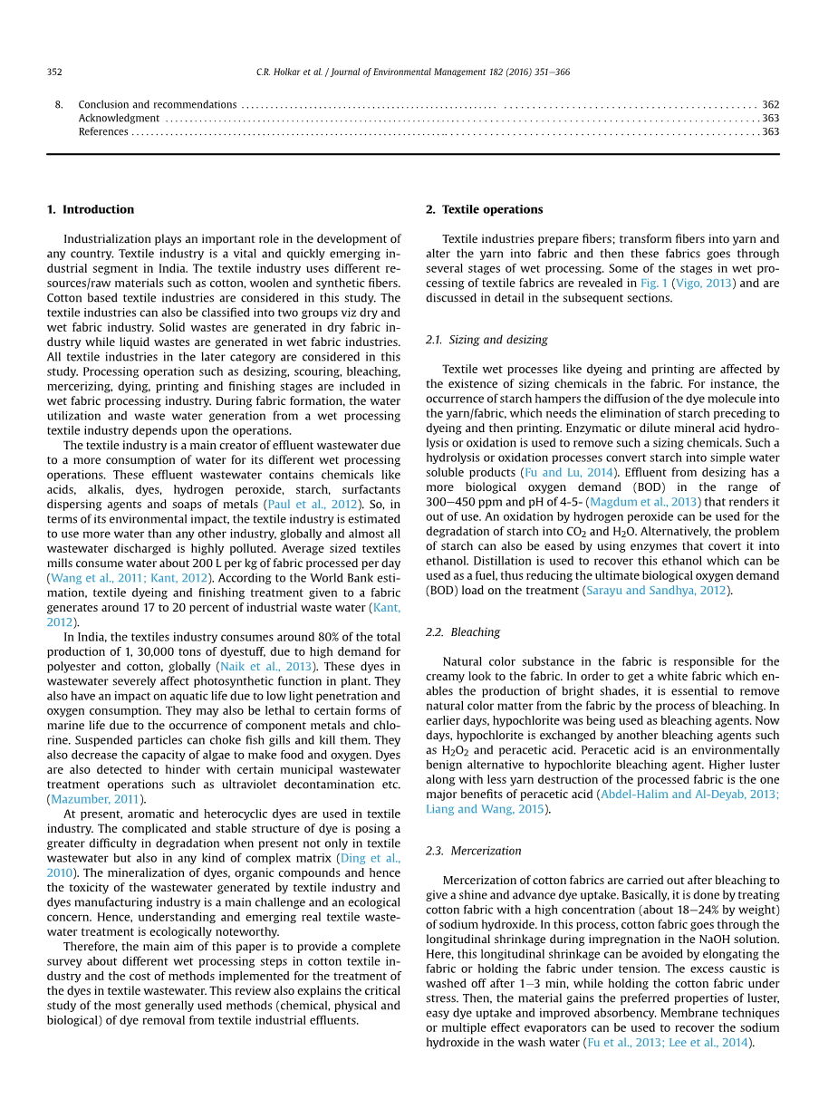 工业化在任何一个国家的发展当中都起着重要的作用。纺织行业作为一个重要的新兴工业领域并迅速在印度发展起来。纺织行业使用不同的资源、原材料如棉花、羊毛和合成纤维。本次研究考虑的是棉花纺织行业。纺织行业也可以分为两种即干布和湿布行业。干布行业产生固体废物而湿面料行业产生液体废物。本次研究考虑所有纺织行业后续的分步操作。处理操作如退浆、精练、漂白、丝光、染色、印刷和完成阶段都包含在湿布行业。在织物制作过程中, 湿处理纺织工业的水的利用和废水产生取决于具体操作。
