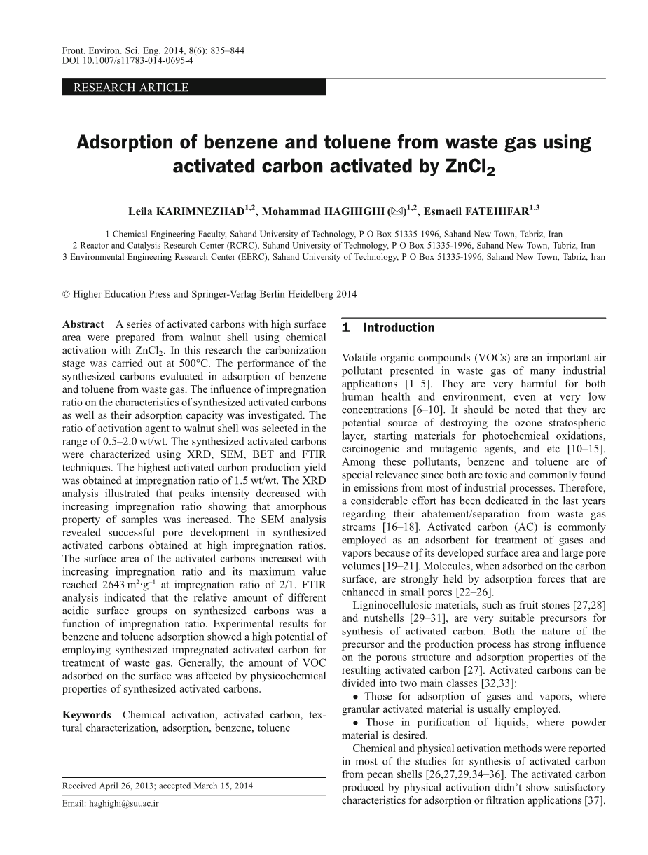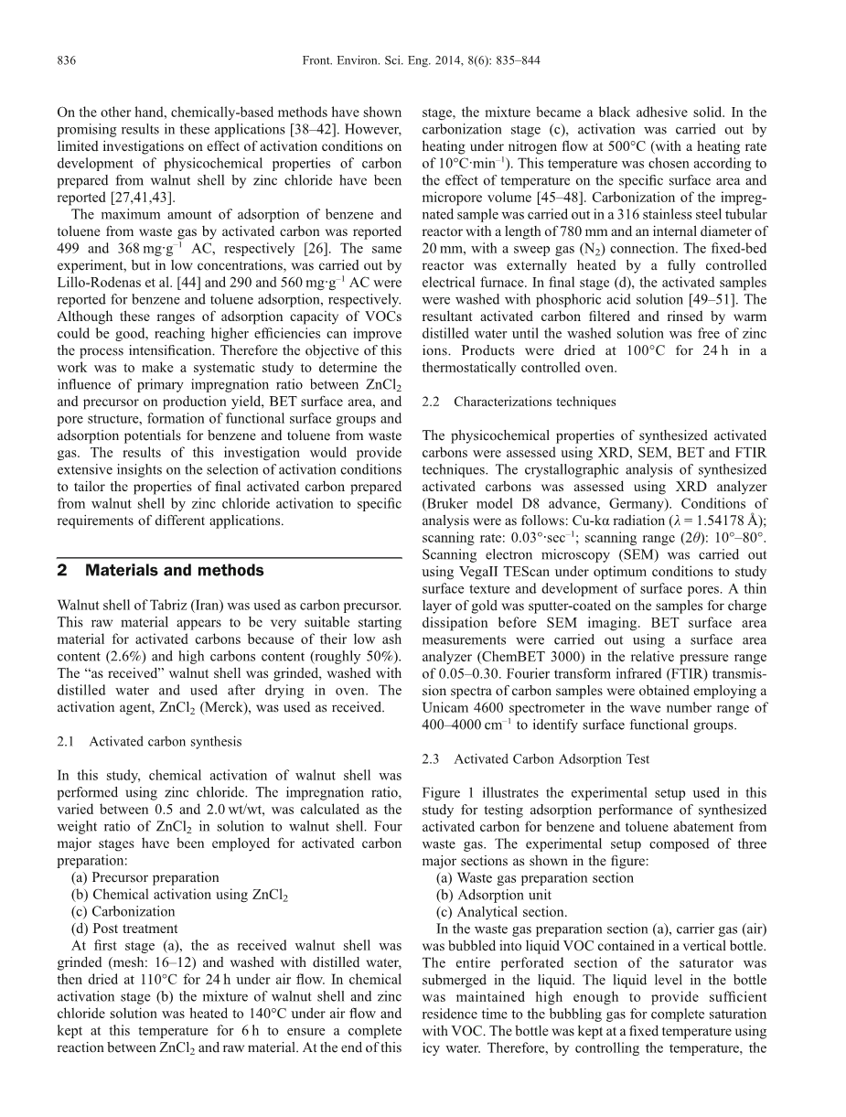 ZnCl2活化活性炭吸附废气中苯和甲苯的研究外文翻译资料