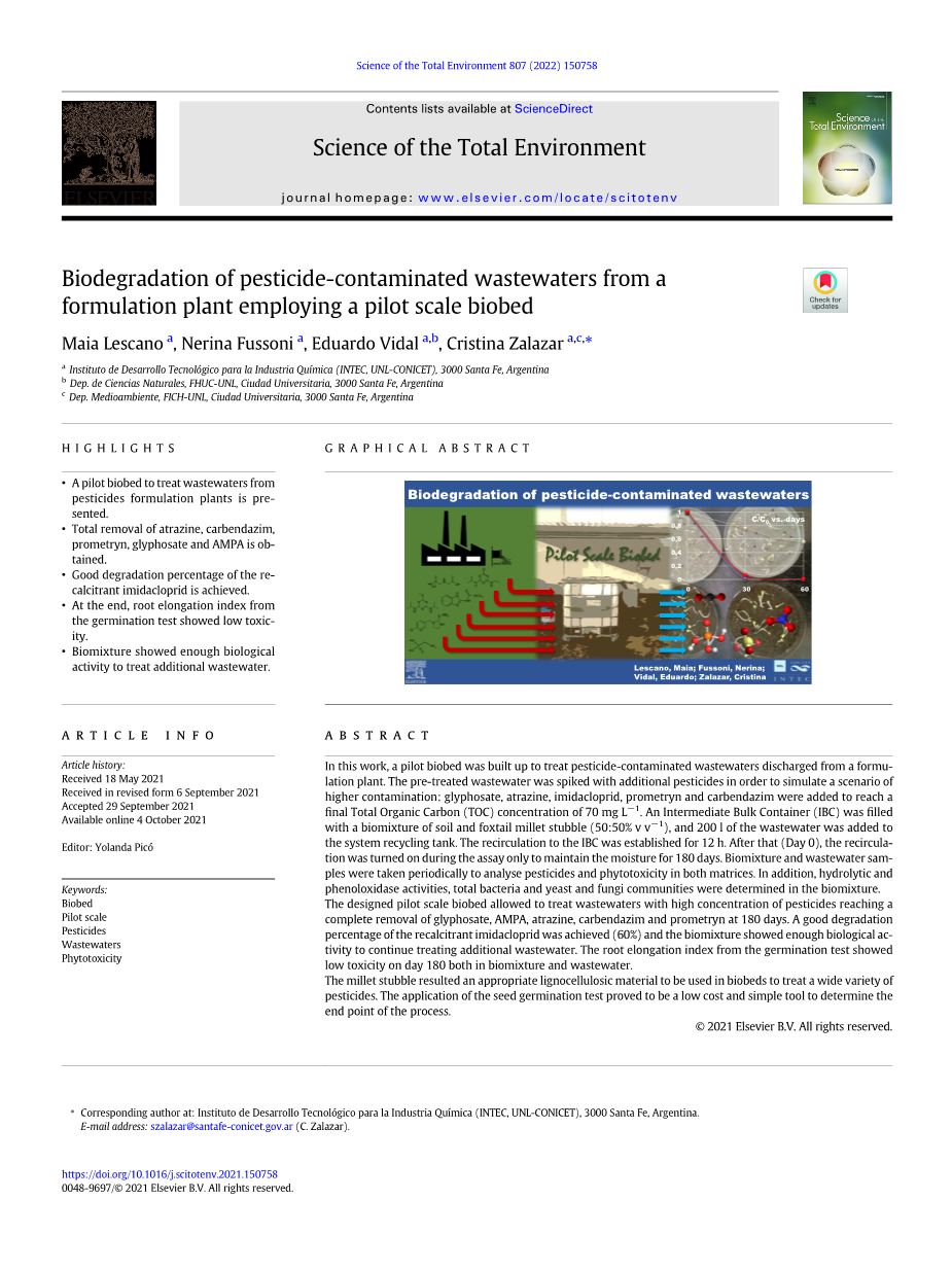 摘要:建立了一种中试生物反应器,用于处理某制剂厂排放的农药污染废水。在预处理后的废水中添加额外的农药,以模拟更高污染的场景:添加草甘膦、阿特拉津、吡虫啉、扑草净和多菌灵,使最终的总有机碳(TOC)浓度达到70 mg/L。将土壤和谷子茬的生物混合物(50:50% v vminus;1)装入中型散货容器(IBC),并将200L废水添加到系统回收槽中。向IBC再循环12小时。之后(第0天),在试验期间打开再循环,仅维持水分180天。定期采集生物混合物和废水样品,分析两种基质中的农药和植物毒性。此外,还测定了生物混合物的水解活性和酚氧化酶活性、细菌总数、酵母和真菌群落。