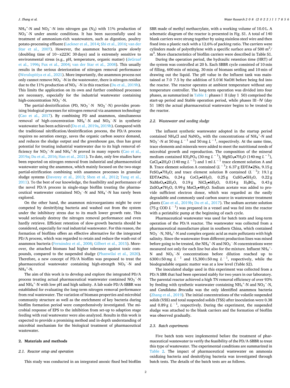 这项工作的目的是开发和探索综合PD/A工艺处理低pH和高盐度的含有NO3--N和NH4 -N的实际制药废水。建立了实验室规模的PD/A-SBBR,用于评估实际废水的长期脱氮性能。综合研究了生物膜形成过程中生物量性质和微生物群落结构的变化以及关键细菌的富集。还分析了EPS对从设置到适应阶段进料与真实废水抑制作用的微生物响应。这项工作的结果有助于深入了解微生物机制并有望为制药废水生物处理提供一种有前途的方法。