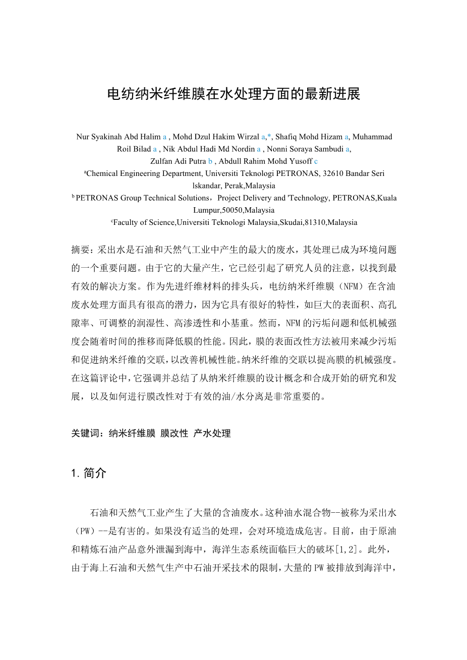 电纺纳米纤维膜在水处理方面的最新进展外文翻译资料