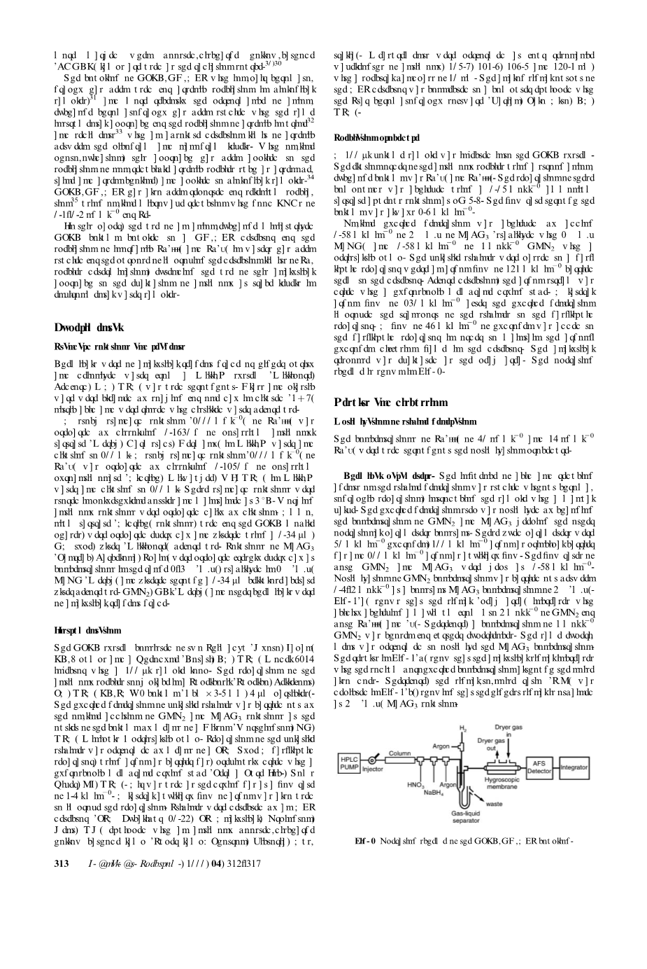 生物样品中测定砷的形态时,离子对色谱法用技术和高效液相色谱-氢化物发生原子荧光光谱法联合已有使用。最近对阴离子交换色谱法的性能进行了研究,用同样的仪器方法对尿中砷的形态和沉积物中砷的绝对检出限可以达到微微克和纳克之间的水品。通过在线光氧化,该方法已应用于诸如甜菜碱和胆碱的非还原砷形态的检测分析,并应用于生物样品之中。硒的形态分析中,采用微波还原,高效液相色谱-氢化物发生-原子荧光光谱法也有报道, LOD为0.2-0.3ng/L。本文对无机Sb(III)和Sb(V)的形态分析使用一种阴离子交换色谱柱连接到一个微型氢化物发生-原子荧光光谱仪的检测方法以提高锑形态分析的检出限,并利用这种分析方法对环境水样中痕量锑进行分析测定。