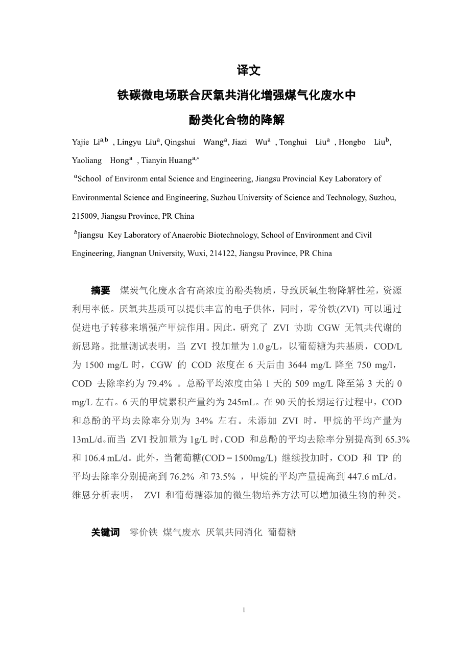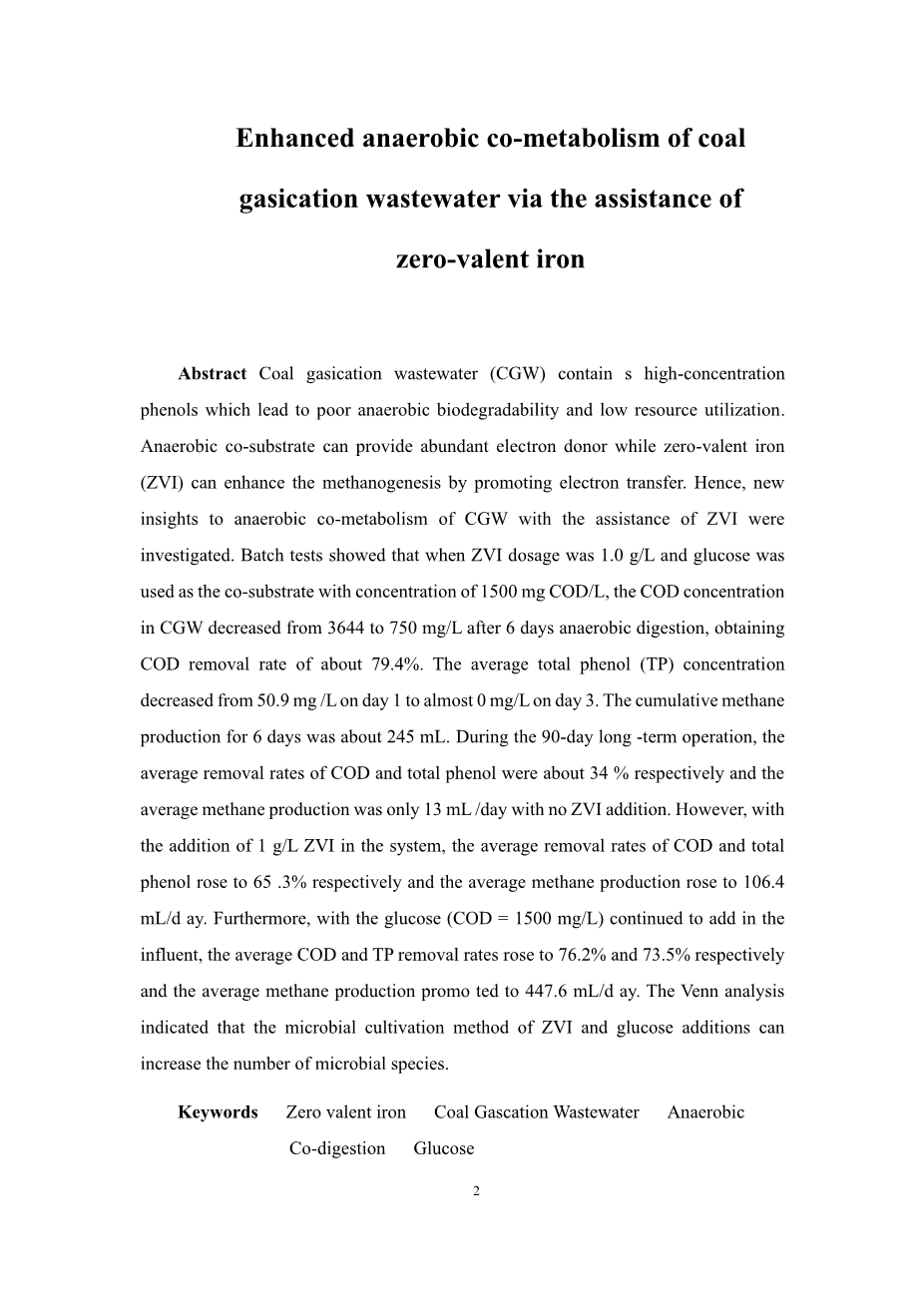 铁碳微电场联合厌氧共消化增强煤气化废水中酚类化合物的降解外文翻译资料