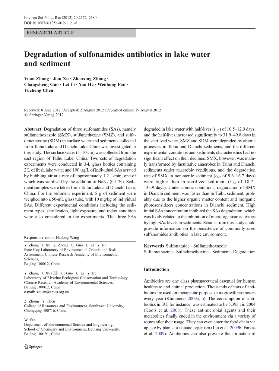 磺胺类抗生素在湖水和沉积物中的降解外文翻译资料
