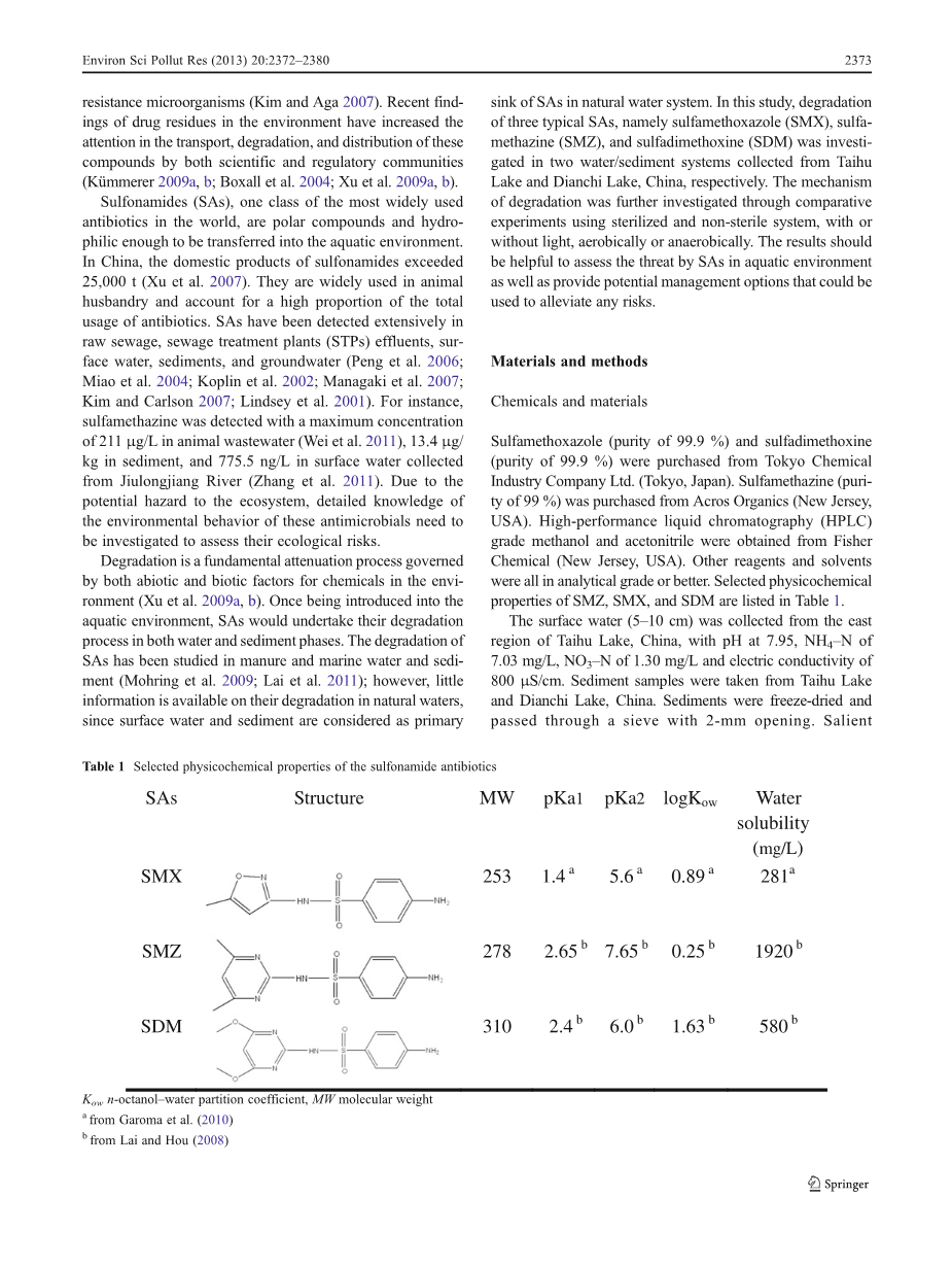 环境中化学品的降解是由非生物和生物因素控制的一个基本衰减过程(Xu等人。 2009a, b)。一旦进入水生环境,SAs将在水和沉积物两阶段进行降解过程。 研究了SAs在粪便、海水和沉积物中的降解(Mohring等人2009,Lai等人2011);尽管天然水体中地表水和沉积物被认为是SA主要的沉积相,但有关天然水中SAs的降解资料却很少。本研究以太湖和滇池为研究对象,分别研究了磺胺甲恶唑(SMX)、磺胺甲嗪(SMZ)和磺胺乙氧嘧啶(SDM)三种典型SAS的在水/沉积物的降解情况。通过对含菌和无菌系统、光降解和无光降解、有氧和厌氧降解的比较实验,进一步探讨了降解机理,包括。研究结果将有助于评估SAs在水生环境中的威胁,并提供可用于减轻潜在风险的管理选择。