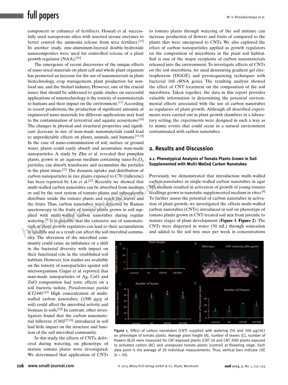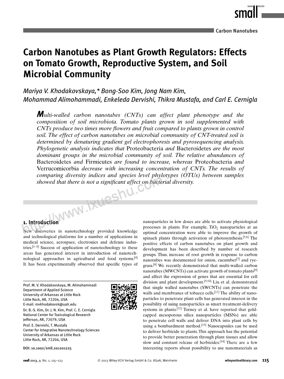 纳米技术的新发现为医学,航空航天,电子和国防工业的许多应用提供了知识和技术平台。[1-3]纳米技术于这些领域的成功应用引起了纳米技术方法用在农业和粮食系统中的兴趣。已经通过实验观察到低剂量的特定类型的纳米颗粒能够激活植物中的生理过程。例如,最佳浓度的二氧化钛纳米粒子能够通过激活光合作用来改善菠菜植物的生长[5,6]。研究小组已经描述了碳纳米管对植物生长和发育的积极影响。因此,记录了洋葱,黄瓜[7]和黑麦草[8]对碳纳米管响应的根生长的增加。我们最近证明,多壁碳纳米管(MWCNTs)可以激活番茄植株的生长[9],并影响细胞分裂和植物发育所必需的基因的表达。[9,10] Liu等。证明单壁纳米管(SWCNTs)可以穿透烟草细胞的壁和膜。[11]纳米粒子穿透植物细胞的能力引起了人们对使用纳米粒子作为植物智能处理传递系统的可能性的兴趣。[12] Torney等人。已经报道,金顶中孔二氧化硅纳米粒子(MSNs)能够穿透细胞壁并通过轰击方法将DNA传递到植物细胞中。[13]纳米胶囊可用于向植物递送除草剂。这种方法有可能提供更好的植物组织渗透,并允许缓慢和持续释放除草剂。[14]有一些有趣的报道是关于使用纳米材料作为肥料成分或增强剂的可能性的。Hossail等人。成功充分利用插入脲酶的纳米多孔二氧化硅,以更好地控制尿素肥料的氨释放。[15] 在另一项研究中,锌铝层双氢氧化物纳米复合材料用于控制植物生长调节剂(NAA)的释放。[16] 最近发现的纳米材料对植物细胞和整个植物生物体的独特影响已经促进了纳米材料在植物生物技术,作物管理,非食用植物生产和生物燃料工业中的使用的增加。然而,指导纳米技术成功应用研究应该解决的一个关键问题是纳米材料对人类的毒性及其对环境的影响。[17]根据最近的预测,用于不同应用的大量工程纳米材料的生产可能导致陆地和水生生态系统的污染。[18]物理和结构性质的变化以及人造纳米材料尺寸的显着减小可能导致对植物,动物和人类的不可预测的影响。[19,20]在土壤,地表或地面受纳米污染的情况下水,植物很容易吸收和积累人造纳米粒子。Zhu等人的一项研究揭示了生长在含有纳米Fe3O4颗粒的水性介质中的南瓜植物可以吸收,转移和积累植物组织中的颗粒。[21]暴露于C70(富勒烯)的水稻植物中碳纳米颗粒的动态摄取和分布[22]已经被Lin等人报道了。因此,在常规浇水期间在供应有多壁碳纳米管的土壤中生长的番茄植物的果实中通过拉曼光谱检测碳纳米管。纳米材料作为植物生长调节剂的广泛使用可能导致其在垃圾填埋场中的积累,并因此可能影响土壤微生物群落。微生物群落的改变可能导致细菌多样性的不平衡或转变,影响它们在已建立的土壤栖息地中的功能作用。然而,很少有关于纳米粒子对土壤微生物的毒性的研究。Gajjar等人报道过人造的Ag,CuO和ZnO组分对土壤细菌分离物 Pseudomonas假单细胞菌 putida KT2440有毒性作用。[23]高浓度的多壁碳纳米管;(ge;500mu;g/ g土壤)会影响土壤中的微生物活性和生物量。[24] 相比之下,其他研究人员发现碳纳米材料富勒烯(土壤中引入的C60 [25,26]对土壤微生物群落的结构和功能影响不大。在该研究中,研究了在浇水期间递送的CNT对成熟番茄植物的表型的影响。我们确定,与未暴露于CNT的植物相比,通过浇灌土壤混合物将CNT施用于番茄植物可以增加花和果实的产量。我们还探讨了碳纳米粒子作为生长调节剂对植物土壤栖息地微生物群组成的影响。土壤是释放到环境中的碳纳米材料的主要接收者之一。为了研究碳纳米管对土壤微生物群的影响,我们使用变性梯度凝胶电泳(DGGE)和焦磷酸测序技术与细菌16S rRNA基因。结果分析表明了CNT处理对土壤微生物群组成的影响。总之,本报告中的数据为确定与使用碳纳米管作为植物生长调节剂相关的潜在环境影响提供了有价值的信息。尽管所有描述的实验都是在实验室环境中的植物生长室中进行的,但实验被用这种方式设计是为了摹拟在碳纳米管污染的自然环境中可能发生的事件。