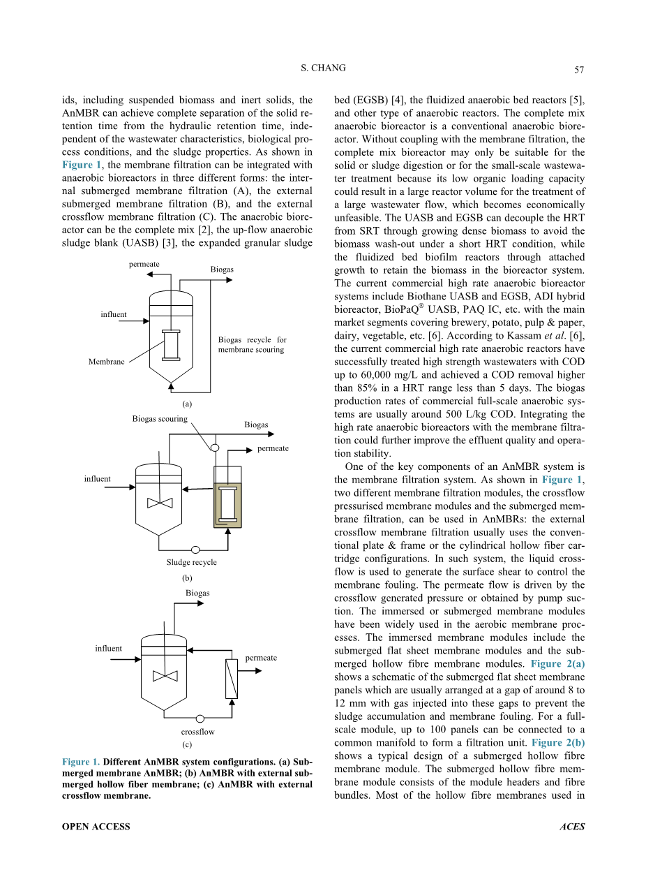 厌氧膜生物反应器是一个由厌氧生物反应器和低压超滤或微滤膜过滤集成的系统。因为MF/UF膜可以保持悬浮固体,包括悬浮生物量和惰性固体,AnMBR可以实现固体停留时间与水力停留时间,独立的废水的特性、生物工艺条件,以及污泥的性质完全分离。如图1所示,膜过滤可与厌氧生物反应器的组成三种不同的形式:内部一体式膜过滤(A),外部浸没式膜过滤(B),和外部错流膜过滤(C)。厌氧生物反应器可以完全混合,升流式厌氧污泥床(UASB),膨胀颗粒污泥床(EGSB),厌氧流化床反应器,和其他类型的厌氧反应器。完全混合厌氧生物反应器是一种常规厌氧生物反应器。不与膜过滤耦合,完全混合反应器只能适用于固体或污泥消化或小型污水处理,由于其有机负荷能力低,可能导致对某大型污水处理反应器在经济上不可行。UASB反应器和EGSB可以通过生长密生物质来从SRT中分离出HRT,以避免短HRT条件下的生物量流出,同时通过附着生长流化床生物膜反应器,以保持在生物反应器系统的生物质。目前商用的高效厌氧生物反应器系统包括百欧仕UASB、EGSB、ADI复合生物反应器,BioPaQ UASB,PAQ IC等主要细分市场包括啤酒、马铃薯、制浆造纸、乳制品、蔬菜等。根据卡萨姆等人研究,目前商业高效厌氧反应器已成功处理高强度废水COD高达60000mg/L,实现了在HRT范围小于5天COD去除率超过85%。商业厌氧系统产气率通常在500L/kg COD。高效厌氧生物反应器与膜过滤相结合能进一步提高出水水质和运行稳定性。