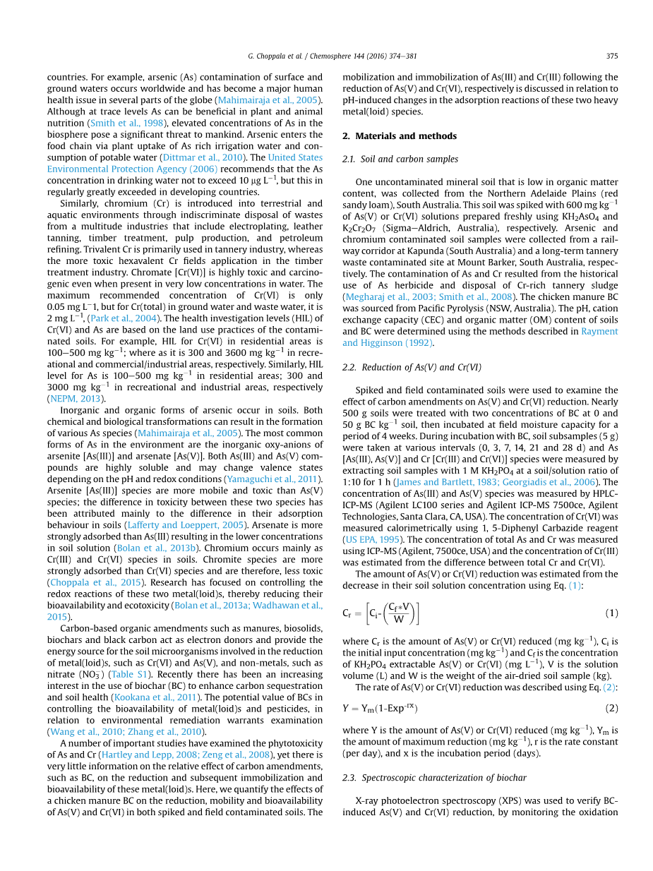 一些重要的研究已经研究了As和Cr的植物毒性(Hartley和Lepp,2008; Zeng et al.,2008),但是关于碳修复剂如生物炭的相对影响对减少和 随后这些金属(loid)的固定化和生物利用度。 在这里,我们量化了一种鸡粪生物炭对As(V)和Cr(VI)在掺杂和土壤污染土壤中的还原,迁移和生物利用度的影响。 关于As(V)和Cr(VI)还原后As(III)和Cr(III)的动员和固定分别讨论了这两种重金属(loid)的吸附反应的pH诱导变化, 种类。