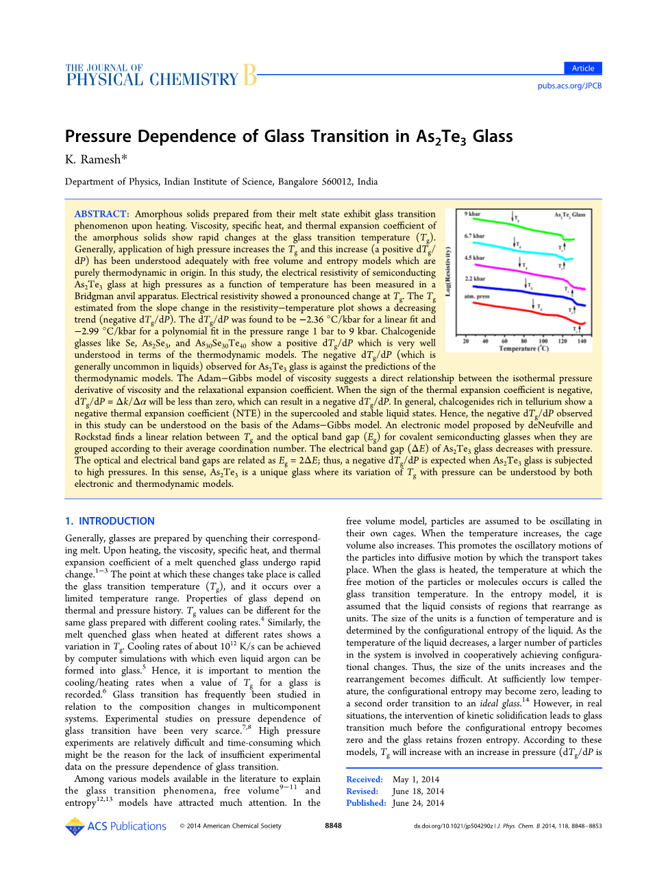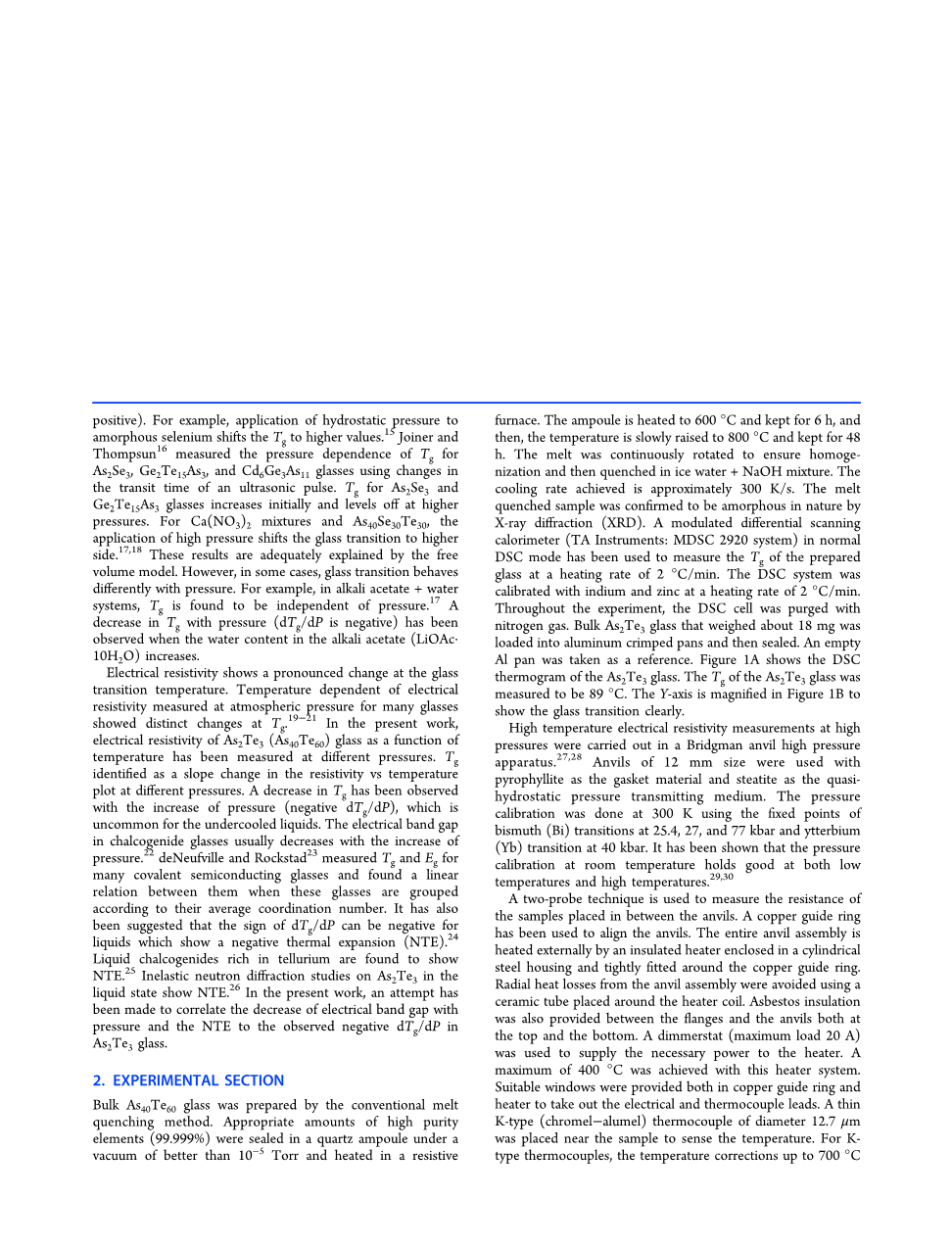 一般来说,玻璃通过淬火相应的融化。加热后, 熔体淬火玻璃粘度、比热、热膨胀系数的进行快速变化。在这些变化发生的点被称为玻璃化转变温度(Tg),它发生在有限的温度范围内。玻璃的性能取决于热和压力的范围。不同的冷却速度制得的相同的玻璃的Tg值可以是不同的。同样,当以不同的速率被加热的熔融骤冷玻璃示出的Tg的变化。1012 K / S的冷却速度可通过计算机模拟来实现,这个可以与液体氩可以形成玻璃。因此,被记录玻璃的的Tg值对于冷却/加热速率是很重要的。玻璃转化经常在关于多组分体系构成的变化被研究。关于玻璃转变的压力依赖性实验研究已经非常稀少。高压实验是相当困难和耗费时间的,这可能是在玻璃转变的压力依存性的缺乏实验数据不足的原因。在文献有可用来解释玻璃转化现象的各种模型,自由体积9-11和熵12,13模型而备受关注。在自由体积模型中,颗粒被假设为在自己笼子振荡。当温度增加,时,笼体积也增加。这促进了颗粒进入扩散运动由运输发生的振荡运动。当玻璃被加热,在该颗粒或分子的自由运动发生的温度被称为玻璃化转变温度。在熵模型中,假设该液体由该重新排列为单位的区域。单位的大小是温度的函数,并且由液体的构型熵确定。由于液体的温度降低,在该系统中大量颗粒是参与协作地实现形状变化。因此,这些单元的大小会增加,并在重排时变得困难。在足够低的温度,所述构型熵可能成为零,导致二级转变到一个理想的玻璃。然而,在实际情况下,动力学凝固的干预多前构型熵变为零,该玻璃保持冻结熵导致玻璃化转换。根据这些模型,Tg将随着压力增加而增加(dTg/ dP为正)。例如,静水压在非晶硒的应用使T g转移至更高的值。Joiner与Thompsun使用超声波脉冲的传播时间的变化来测定的As2Se3,Ge2Te15As3和Cd6Ge3As11玻璃的压力依赖性的Tg 。As2Se3和Ge2Te15As3玻璃的Tg为最初增加,在较高压力下会下降。对于Ca(NO 3)2的混合物As40Se30Te30,高压力的应用将这个玻璃转化移到较高一侧。这些结果是通过自由体积模型充分解释。然而,在某些情况下,玻璃转化会随着压力产生不同的行为。例如,在碱醋酸盐 水系统,Tg为被发现是独立于压力的。当在碱性醋酸中水含量的增加,Tg随着压力(dTg/ dp为负)的减少已经被观察到。电阻率显示了在玻璃转化温度的显著的变化。许多玻璃的温度大气压力测量的电阻率表明在Tg明显变化。在目前的工作中,As2Te3(As40Te60)玻璃作为温度的函数的电阻率已经在不同压力下测定的。Tg定义为在不同压力下的电阻率和温度曲线图的斜率变化。Tg随着压力的增加而降低已经被观察到(负DTG/ DP),这对于过冷液体是罕见的。硫属化物玻璃的电气带隙通常随着压力的增加而减小。deNeufville和Rockstad测定对于许多共价半导体玻璃的Tg和Eg,发现它们之间的线性关系,当这些玻璃根据它们的平均配位数被分组。还已经提出,dTg/ dP的符号可以是负为液体,其显示出负热膨胀(NTE)。丰富的碲液硫族化合物被发现显示NTE。在液体状态下的As2Te3非弹性中子衍射研究显示NTE。在目前的工作中,已经尝试用关联的电带隙随着压力的减小而减小。