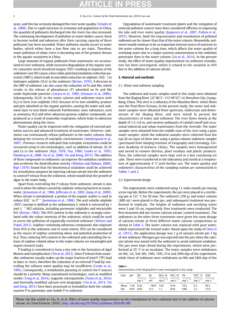 水体中污染的持续发展已超过了它的承受能力范围致使水体变得浑浊以及气味污染的超标。水污染主要发生在流速低或静止的水中。因此,在中国水生生态系统中,城市河流的水污染正在成为最大的威胁之一。由于积累了大量来自废水的有机污染物在河流沉积物中,有机物过度降解消耗大量溶解氧(DO),导致缺氧沉淀。 LowDO引起低还原电位[氧化还原电位(ORP)],导致硫酸盐(SO4 2 - )的生物降解硫化氢(H2S)沉积物(Berner,1970)。减少沉积物的ORP也会造成Fe和Mn的还原,导致吸附在Fe和Mn上的磷(P)的释放氧化物-氢氧化物颗粒(Caraco等,1989; Schauser等,2006)。随后,水体中的Fe(II)与沉积物发生反应。硫化氢由于其低溶解度产物而形成硫化铁(FeS)并吸附在有机颗粒上,造成水和沉积物层变成黑色。此外,有毒物质等是由氨,硫化氢和其他有气味的硫化合物由于无氧呼吸而产生,这导致了气味沿河流蔓延现象。所以,减少外部污染可以改善水质来源和废水的深度处理。但是,沉积物因此可以持续释放污染物到水柱延缓富营养化环境的恢复(Soslash;ndergaard等,2007)。有研究表明富营养化生态系统可能是采用原位技术回收,如添加硝酸盐,铝,铁和Ca到沉积物中(Ripl,1976; Foy,1986; Cooke等,1993;Kleeberg等,2000; Xu等人,2008; Yin和Kong,2015)。另外这些化合物沉淀物可以改善氧化条件并加速反硝化活动(Shimizu和Nakano,2009)。Ripl(1976)发现可以实现生物化学氧化通过将硝酸钙注入沉积物来达到治理目的以控制沉积物中磷的释放,从而限制磷的生长水体中的藻类。除了控制沉积物中磷的释放,硝酸盐也可用于消除在废水中由硫酸盐还原菌引起的气味(Jenneman等,1986; Jefferson等,2002; Jiang等,2009)。当硝酸盐被代谢时,一部分有机物被用于将SO 4 2-还原成S2-(Jenneman等,1986)。酸性挥发性硫化物(AVS)概念被定义为由1提取的沉积Smol·L-1 HCl溶液,包括孔隙水硫化物和亚稳态FeS(Berner,1964)。沉积物中的AVS含量强相关以及可以使用的沉积物的颜色强度评估有机物富集沉积物的污染(威尔逊和威尔逊Vopel,2012)。含硫的气味化合物也起源于来自AVS的沉积物,并且在一定程度上可以考虑AVS作为含硫气味的来源以及潜在的生产H2S。因此,减少沉积物中的AVS含量并控制其释放的硫相关气味是有意义的并且紧迫的研究任务。P负荷被认为在藻类的形成中起关键水华和富营养化的作用(Yin et al。,2013)。由于P释放自厌氧沉积物通常构成总P(TP)负荷的主要部分在湖泊或河流中,因此通过控制减少外部P负荷进水水质可能远远不够(Cooke等,1993年)。因此,一个以控制P源为主的治理计划该是一个优先考虑的项目。许多修改技术,如修改沸石(Yang等,2014),磁性微粒(Funes等,2016)和热改性的富钙绿坡缕石(Yin et al。,2013; Yin和Kong,2015)已被处理以固定可溶性蛋白质活性磷在沉积物中的孔隙水和活动磷。