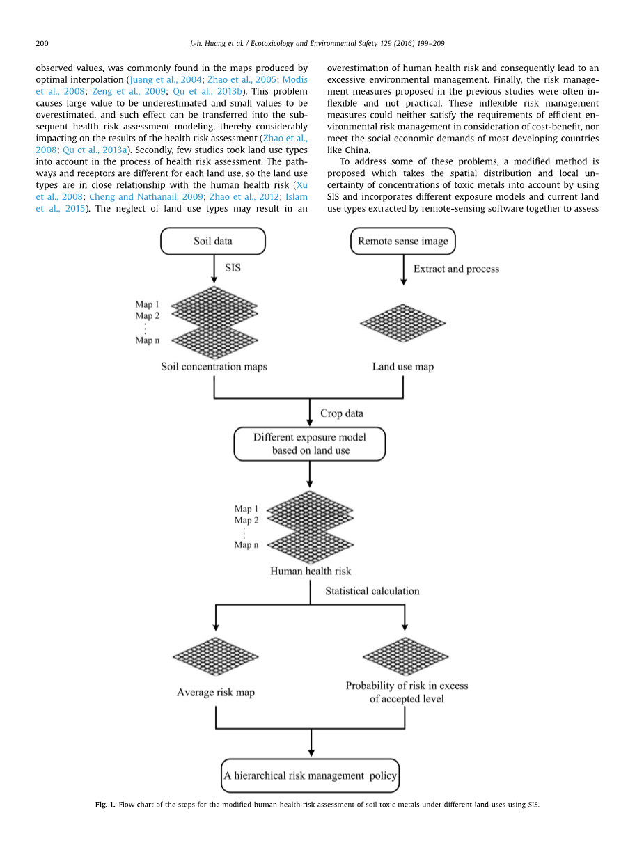 近年来,越来越多的研究用单一评价模型定量评价了人类暴露于土壤有毒金属的健康风险(Lim et al., 2009;Wang et al., 2014;Caiet al., 2015;Li et al., 2015c)。 为保留风险的空间分布,一些研究采用地统计学插值法,如反距离加权法,克立格法或指示克立格法来评价人类健康风险评价过程中土壤中的有毒金属浓度(Guo et al., 2012;Li et al., 2014;Zhao et al.,2014;Xiao et al., 2015)。通过将计算结果与被视为“安全”或“可接受”的监管截止水平进行比较,一些研究已确定了优先污染物/地区并提供了初始风险管理措施(Korre et al.,2002;Si-masuwannarong and Satapanajaru, 2012;Ji et al., 2013)。 但是,根据近年来的一些研究,评价过程存在一些缺陷。首先,在通过最优插值生成的图中通常发现平滑效应,其导致估计值中的变化比观察值更小(Juang et al., 2004;Zhao et al., 2005;Modis et al., 2008;Zeng et al., 2009;Qu et al., 2013b)。这个问题导致较大的价值被低估,较小的价值被高估,这种影响可转移到后续的健康风险评价模型中,从而显着影响健康风险评价的结果(Zhao et al.,2008;Qu et al., 2013a)。其次,在健康风险评价过程中,很少有研究考虑土地利用类型。每种土地利用的途径和受体都不相同,因此土地利用类型与人类健康风险密切相关(Xu et al., 2008;Cheng and Nathanail, 2009;Zhao et al., 2012;Islam et al., 2015)。忽视土地使用类型可能导致对人类健康风险的高估,从而导致过度的环境管理。最后,以往研究中提出的风险管理措施往往是不灵活和不实际的。这些灵活的风险管理措施既不能满足有效的环境风险管理要求,也不能满足中国等大多数发展中国家的社会经济需求。为了解决这些问题,提出了一种修改方法,该方法通过使用SIS来考虑有毒金属浓度的空间分布和局部不确定性,并将不同的暴露模型和由遥感软件提取的当前土地利用类型合并到一起 评价人体暴露于有毒金属的风险。