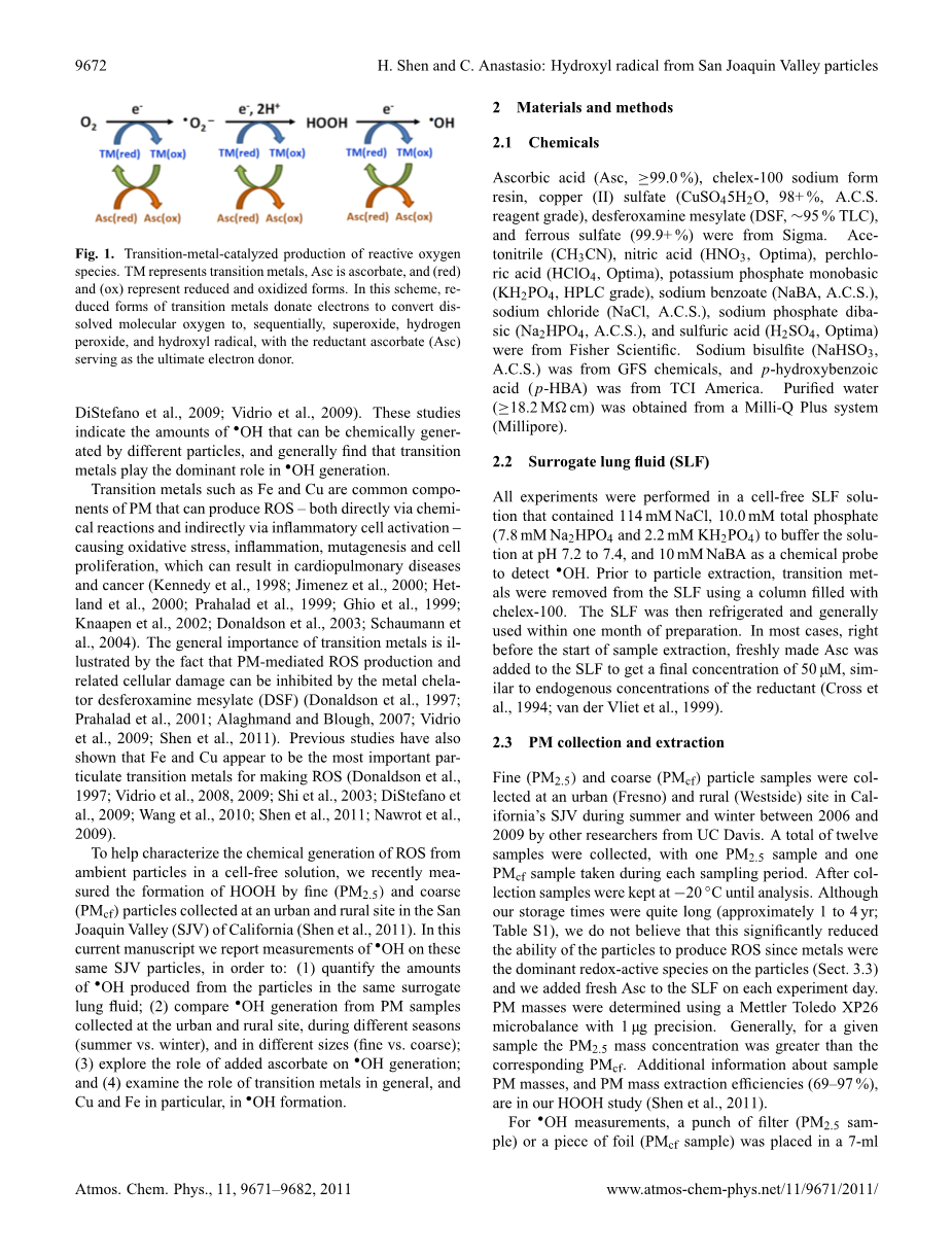 为了表征在无细胞溶液中环境颗粒里活性氧的化学形成,之前我们测定了从加利福尼亚的圣华金河谷一个城市和农村收集的细颗粒物PM2.5和粗颗粒物PMcf产生的过氧化氢(Shen等人,2011)。在现在的研究中,我们测定了相同的圣华金河谷的颗粒产生的羟基自由基,为了(1)在同一模拟肺液中定量由颗粒产生的羟基自由基。(2)对比城市和农村在不同季节(夏天和冬天),采集不同颗粒大小(细与粗),所产生的羟基自由基。(3)探索添加抗坏血酸对羟基自由基的影响。(4)研究过渡金属,特别是铜和铁对羟基形成的作用。