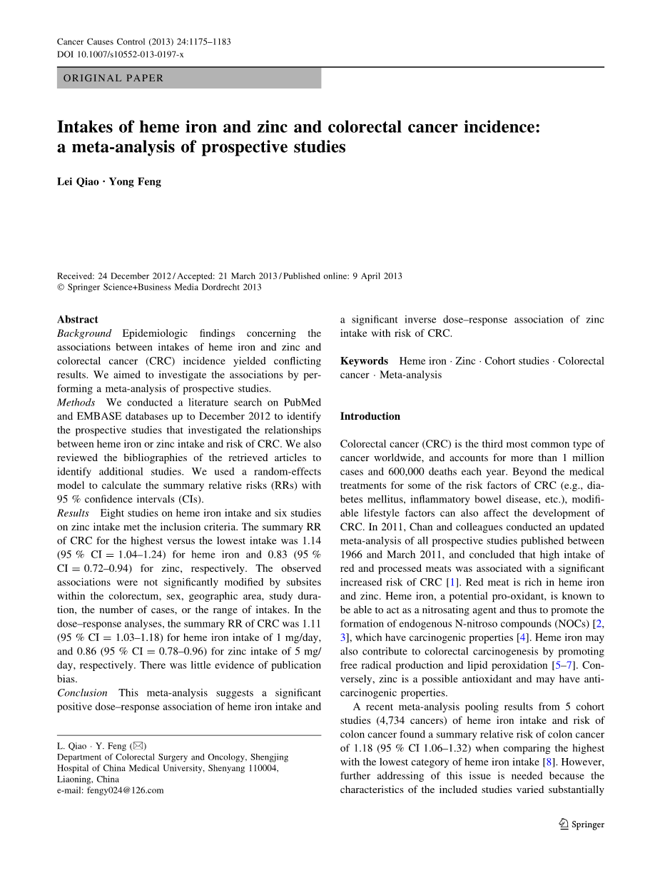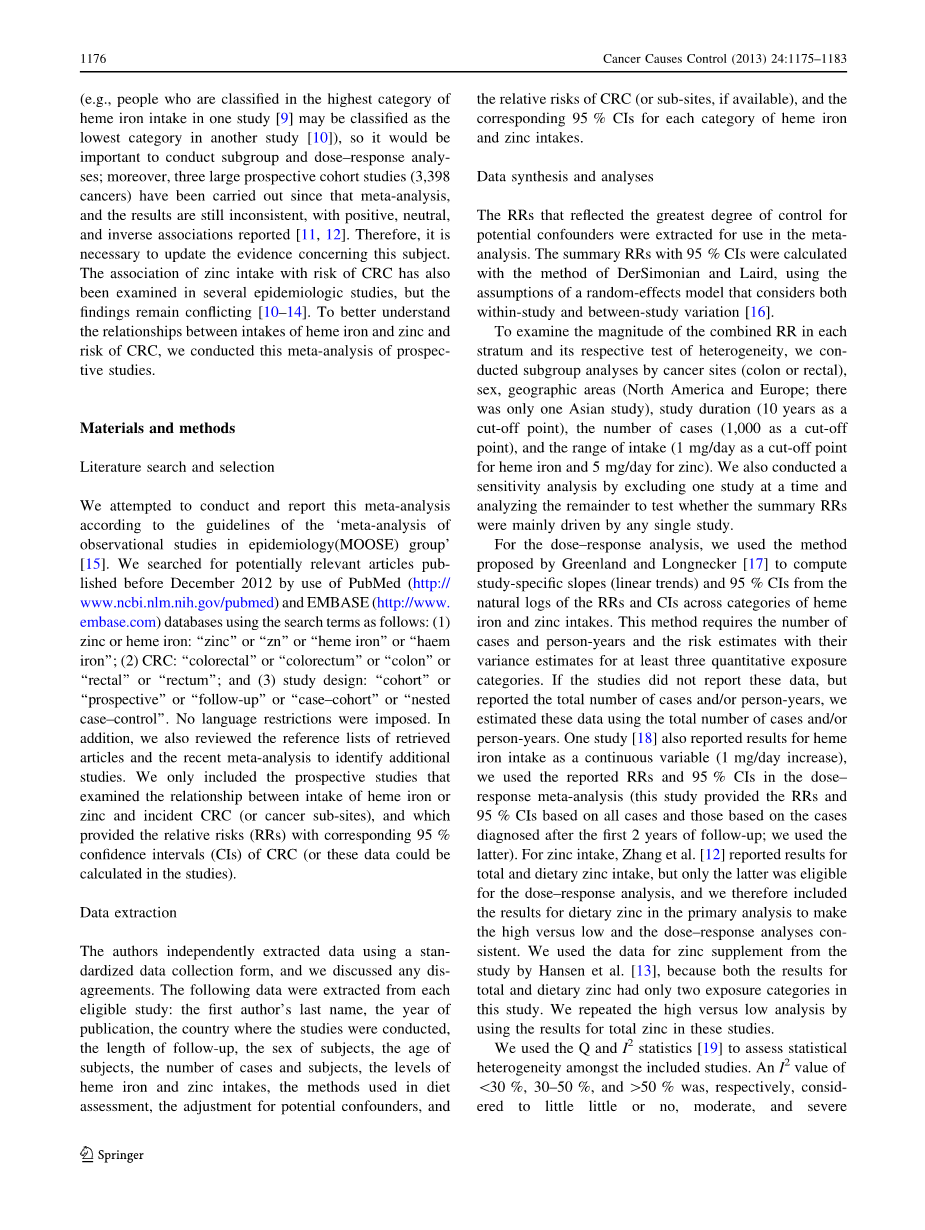 最近对血红素铁摄入量和结肠癌风险的 5 项队列研究(4,734 种癌症)的荟萃分析汇总结果发现,将最高类别与最低类别进行比较时,结肠癌的总体相对风险为 1.18(95 % CI 1.06–1.32)血红素铁摄入量[8]。然而,需要进一步解决这个问题,因为纳入研究的特征差异很大(例如,在一项研究中被归类为血红素铁摄入量最高类别的人 [9] 在另一项研究中可能被归类为最低类别[9]。 10]),因此进行亚组和剂量反应分析很重要;此外,自那次荟萃分析以来,已经进行了三项大型前瞻性队列研究(3,398 例癌症),结果仍然不一致,报告了正、中性和负相关 [11, 12]。因此,有必要更新有关该主题的证据。几项流行病学研究也研究了锌摄入量与 CRC 风险的关联,但结果仍然相互矛盾 [10-14]。为了更好地了解血红素铁和锌的摄入量与 CRC 风险之间的关系,我们对前瞻性研究进行了荟萃分析。