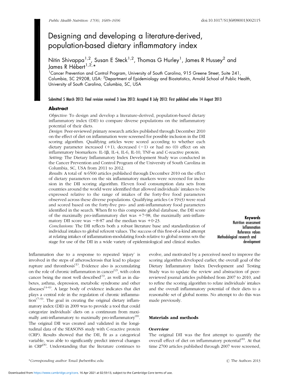 Objective: To design and develop a literature-derived, population-based dietary inflammatory index (DII) to compare diverse populations on the inflammatory potential of their diets.