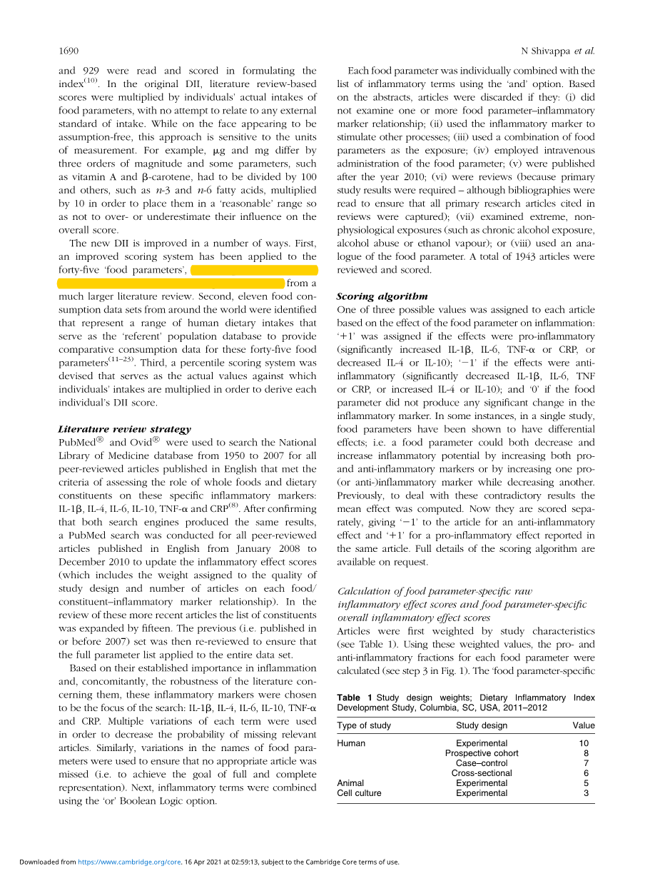 Results: A total of asymp;6500 articles published through December 2010 on the effect of dietary parameters on the six inflammatory markers were screened for inclusion in the DII scoring algorithm. Eleven food consumption data sets from countries around the world were identified that allowed individuals intakes to be expressed relative to the range of intakes of the forty-five food parameters observed across these diverse populations. Qualifying articles (n 1943) were read and scored based on the forty-five pro- and anti-inflammatory food parameters identified in the search. When fit to this composite global database, the DII score of the maximally pro-inflammatory diet was 7·98, the maximally anti-inflammatory DII score was -8·87 and the median was 0·23.