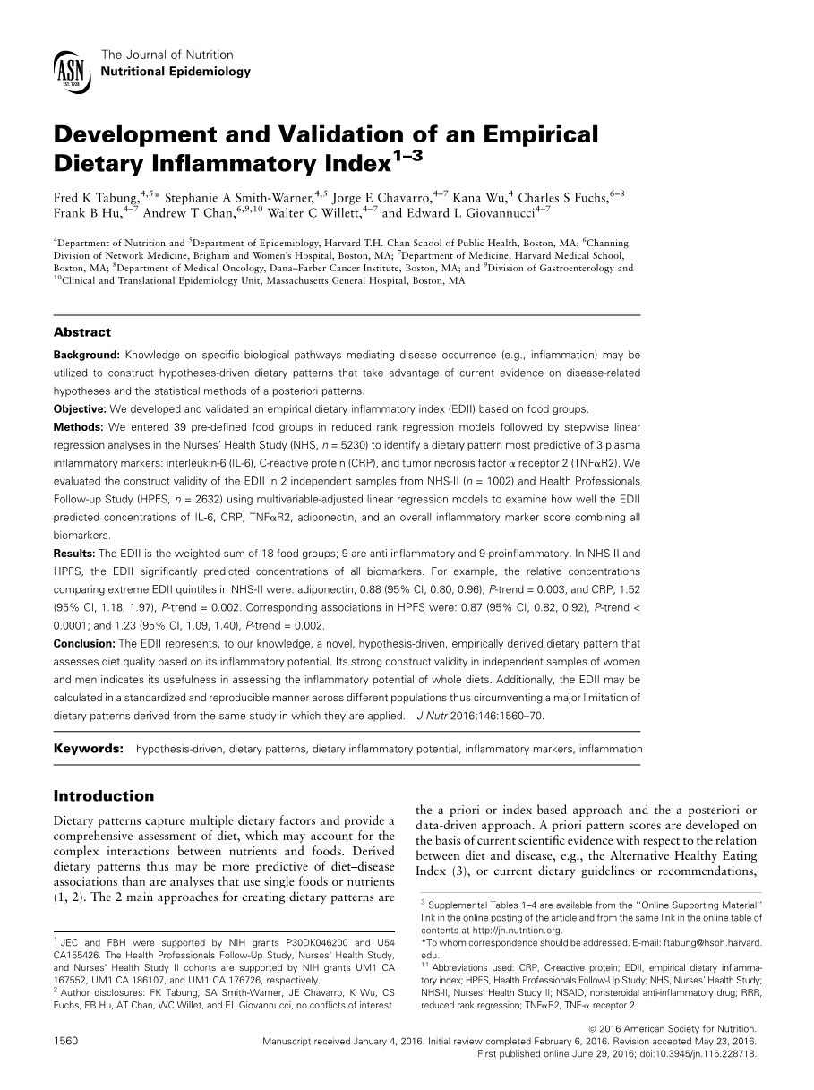 结论:本次研究表明,EDII代表了一种新颖的、假设驱动的、经验衍生的饮食模式,它基于炎症潜力评估饮食质量。其在女性和男性独立样本中具有较强的构造有效性,这表明它在评估整个饮食的炎症潜力方面是很有用的。此外,EDII可以在不同人群中以标准化和可重复的方式计算,从而规避了应用该方法的同一研究中产生的饮食模式的主要限制。