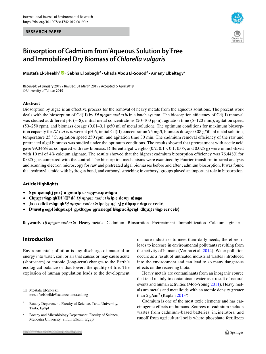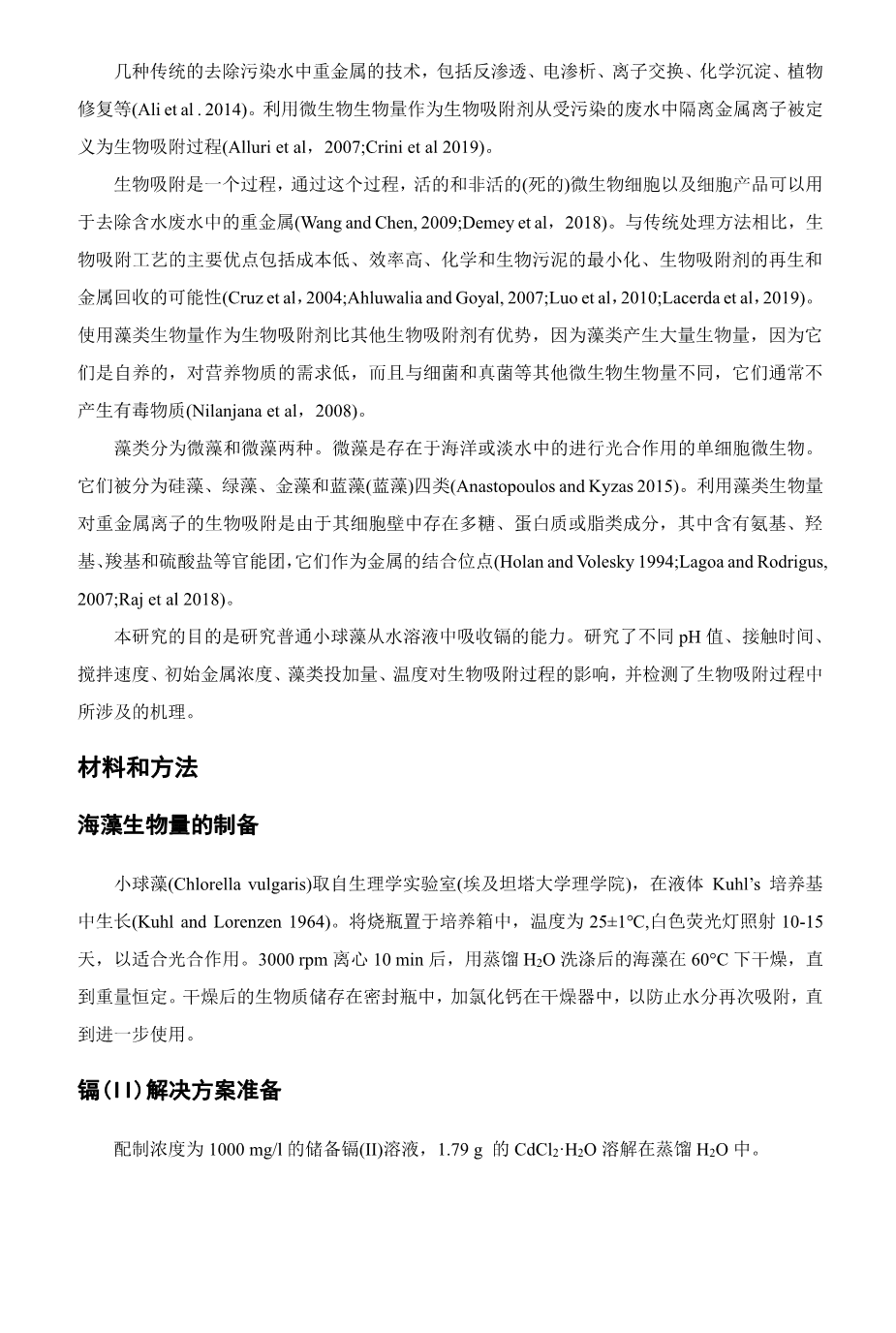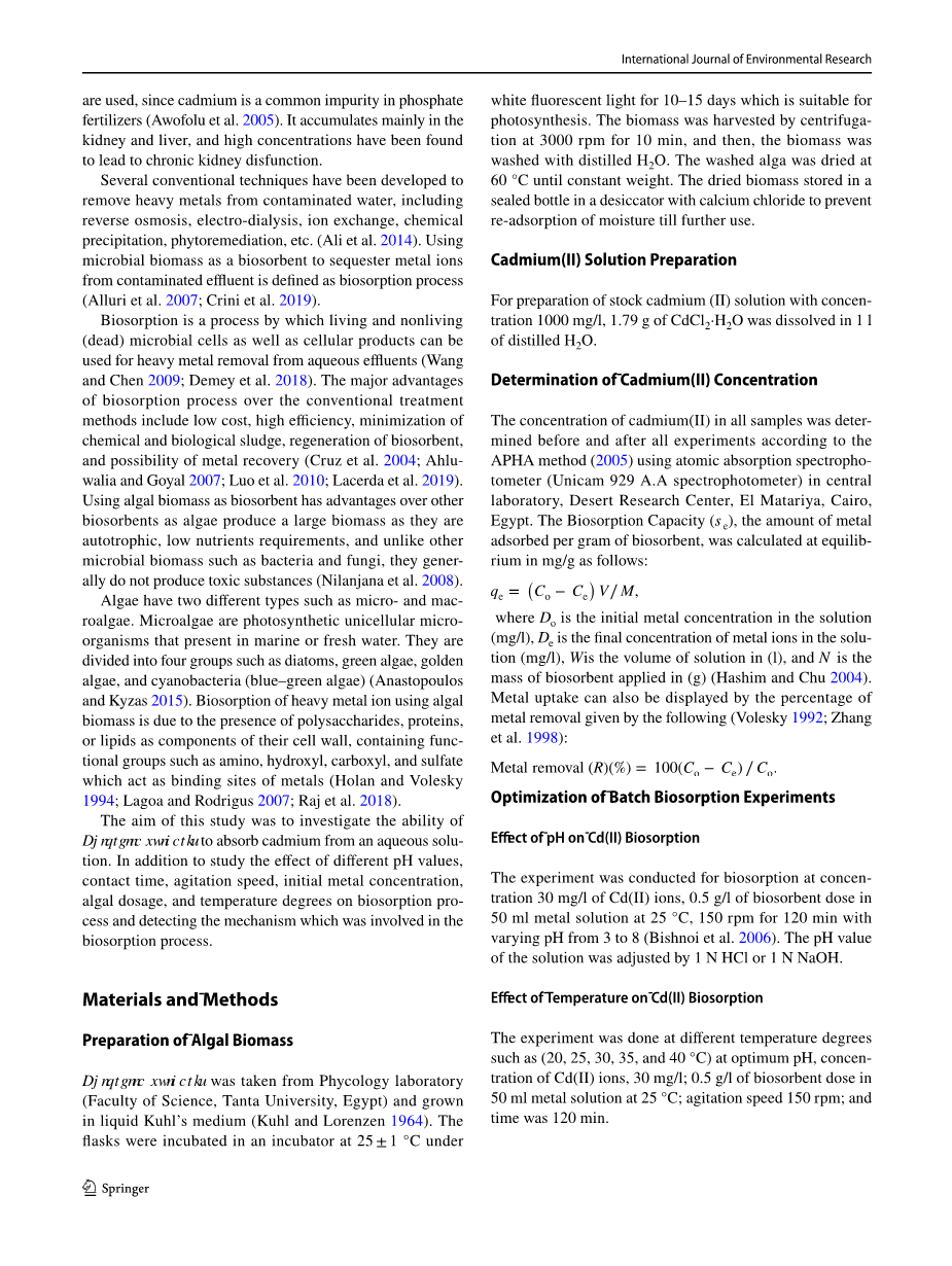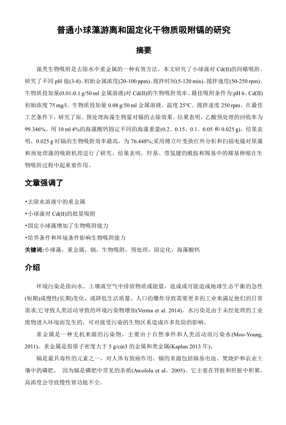 普通小球藻游离和固定化干物质吸附镉的研究外文翻译资料