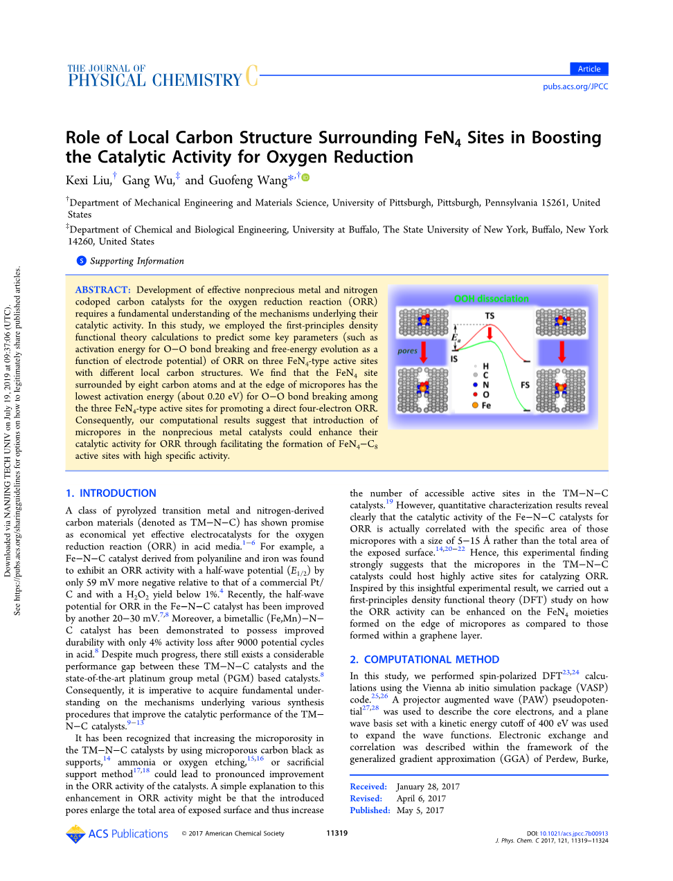TMminus;Nminus;C催化剂中可接近的活性位点的数量。然而,定量表征结果清楚地揭示了Fe-N-C催化剂对ORR的催化活性实际上与尺寸为5-15Aring;的微孔的特定面积相关,而不是暴露表面的总面积。因此,这一实验结果有力地表明,TM-N-C催化剂中的微孔可能具有催化ORR的高活性位点。受这个见解深入的实验结果的启发下,我们进行了第一原理密度泛函理论(DFT)的研究,研究了在微孔边缘形成的FeN4部分与在石墨烯层中形成的FeN4部分相比,如何增强ORR活性。