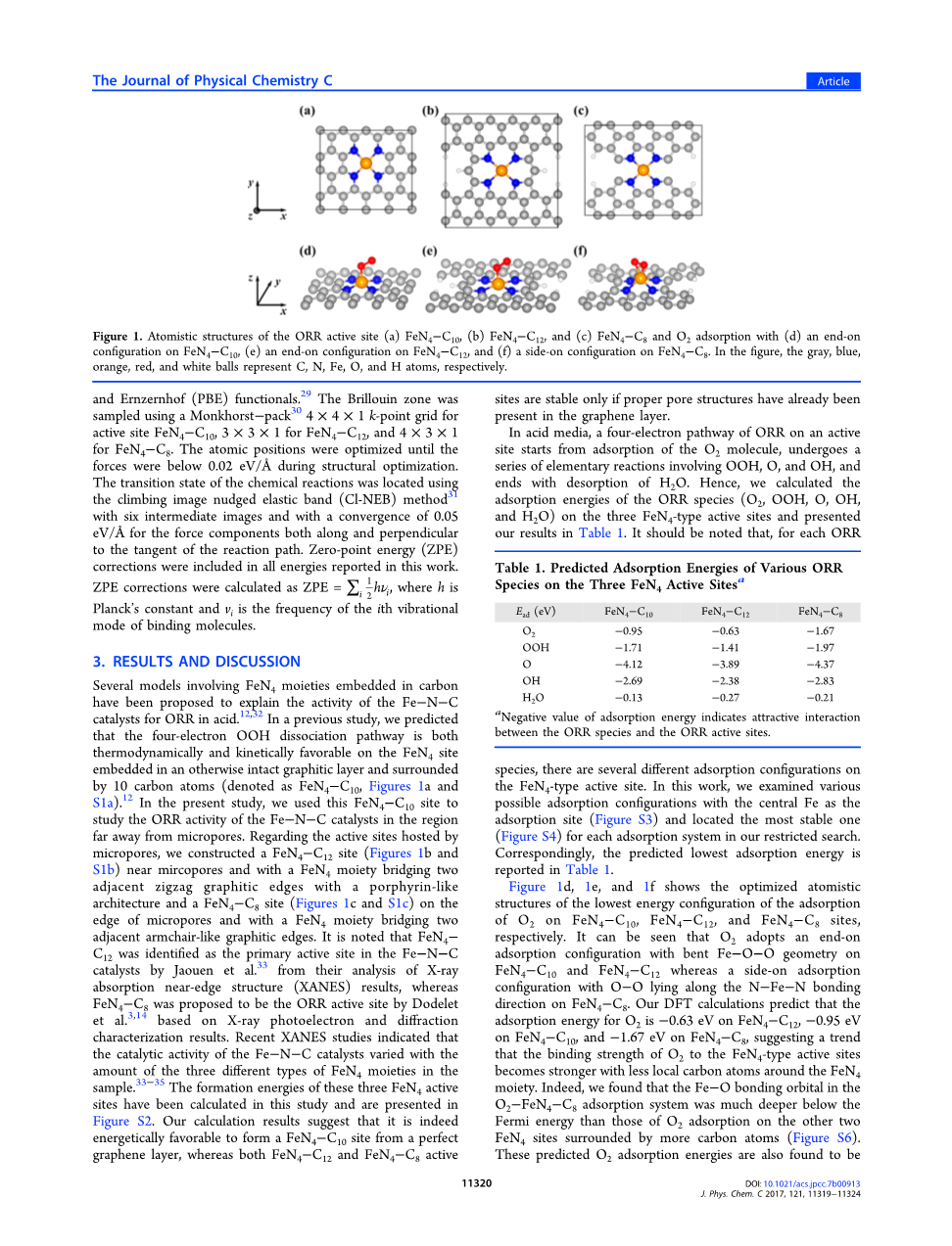 提出了几种含FeN4基团的碳催化剂模型来解释FeN-N-C催化剂的酸催化活性。在之前的研究中, 我们预测四电子OOH解离途径在FeN4位嵌入在一个原本完整的石墨化层中的位置,并且被10个碳原子包围(表示为FeN4-C10,图1 a和 S1a)。在本研究中,我们使用FeN4-C10位来研究远离微孔区域的Fe-N-C催化剂的ORR活性。 关于微孔所承载的活性位点,我们在微孔附近构建了一个FeN4C12位点(图1 b和S1b),并且具有FeN4部分桥接两个相邻的锯齿形石墨边缘,具有卟啉样结构和FeN4C8位点( 图1 C和 S1c)边缘的微孔和分4部分桥接两个相邻的扶手椅状石墨边缘。值得注意的是,Jaouen等人通过对X射线吸收近边结构(XANES)结果的分析,确定FeN4C12为FeNC催化剂中的主要活性中心,而Dodelet等人基于X射线光电子和衍射表征结果提出FeN4C8为活性中心。最近的XANES研究表明,Fe-N-C催化剂的催化活性随样品中三种不同类型FeN4部分的量而变化。这三个FeN4活性位的形成能在本研究中计算并在图S2中呈现。我们的计算结果表明,它确实在能量上有利于从一个完美的石墨烯层形成FeN4-C10,而 FeN4-C12和FeN4-C8都是活性的,只有在适当的孔结构下,石墨烯层中的位置才是稳定的。