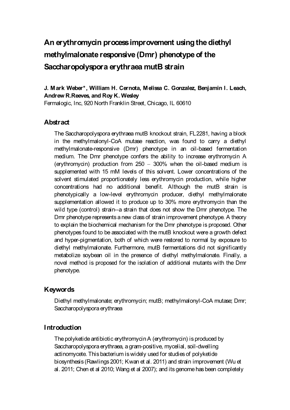 本文报道了甲基丙二酸二乙酯与糖多孢红霉菌株联用的益处。同时还讨论了一种改进传统菌株改良方法的新策略,使商业菌株在现有生产平台的基础上得到改良。