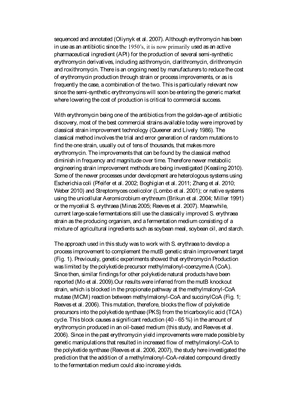 聚酮类抗生素红霉素A(红霉素)是由一种阳性的、菌丝的、土壤中的放线菌产生的。这种细菌广泛用于聚酮生物合成的研究(Rawlings 2001;Kwan 等人. 2011)和改善品种(Wu 等人. 2011;Chen等人2010;Wang 等人 2007);其基因组已被完全测序和标注(Oliynyk 等人. 2007)。虽然红霉素自20世纪50年代以来一直作为抗生素使用,但现在主要用作活性药物成分(API),用于生产几种半合成品红霉素衍生物,包括阿奇霉素、克拉霉素、地红霉素和罗红霉素。制造商需要通过菌株或工艺改进来降低红霉素生产的成本,或者通常是两者的结合。这一点现在尤为重要,因为半合成品红霉素很快就会进入仿制药市场,因此降低生产成本对商业成功至关重要。