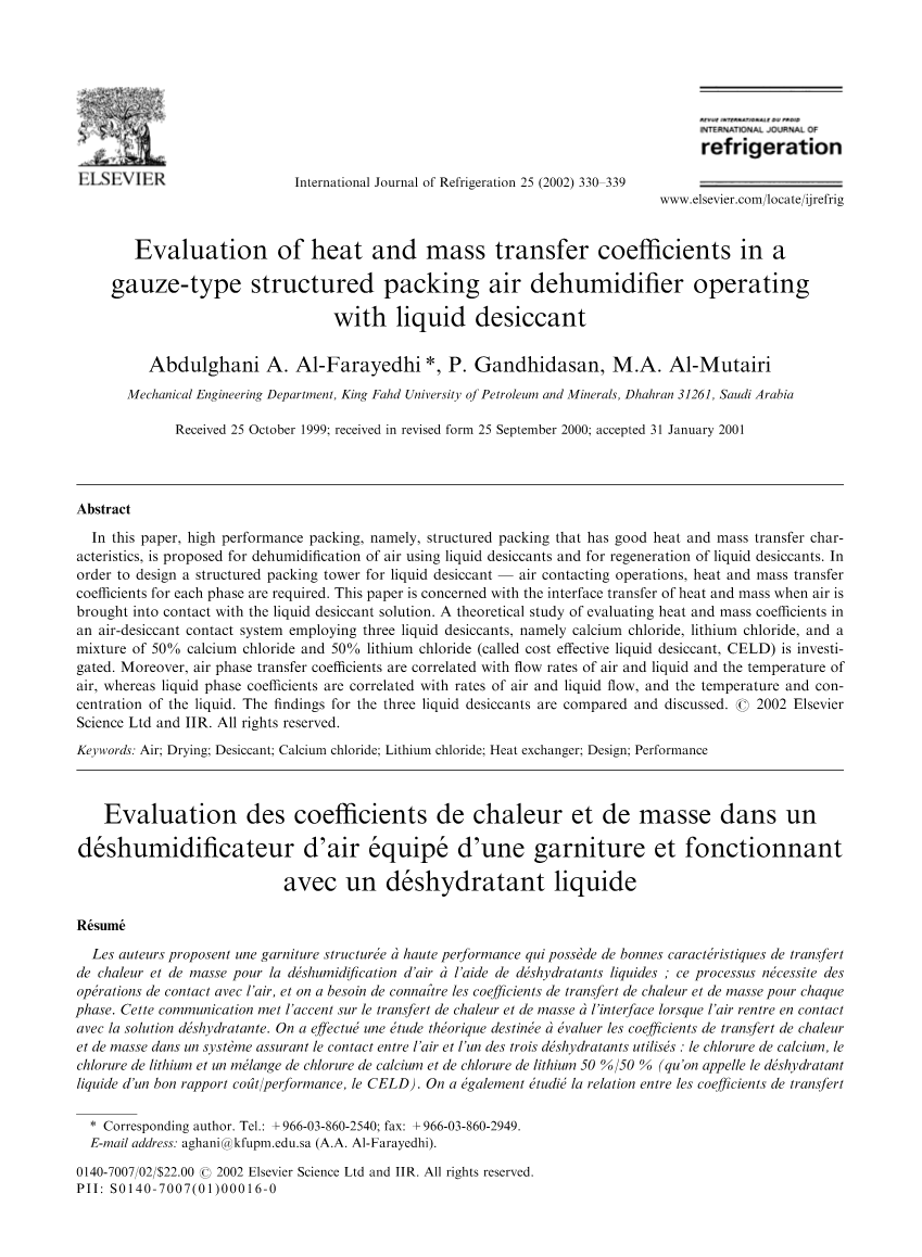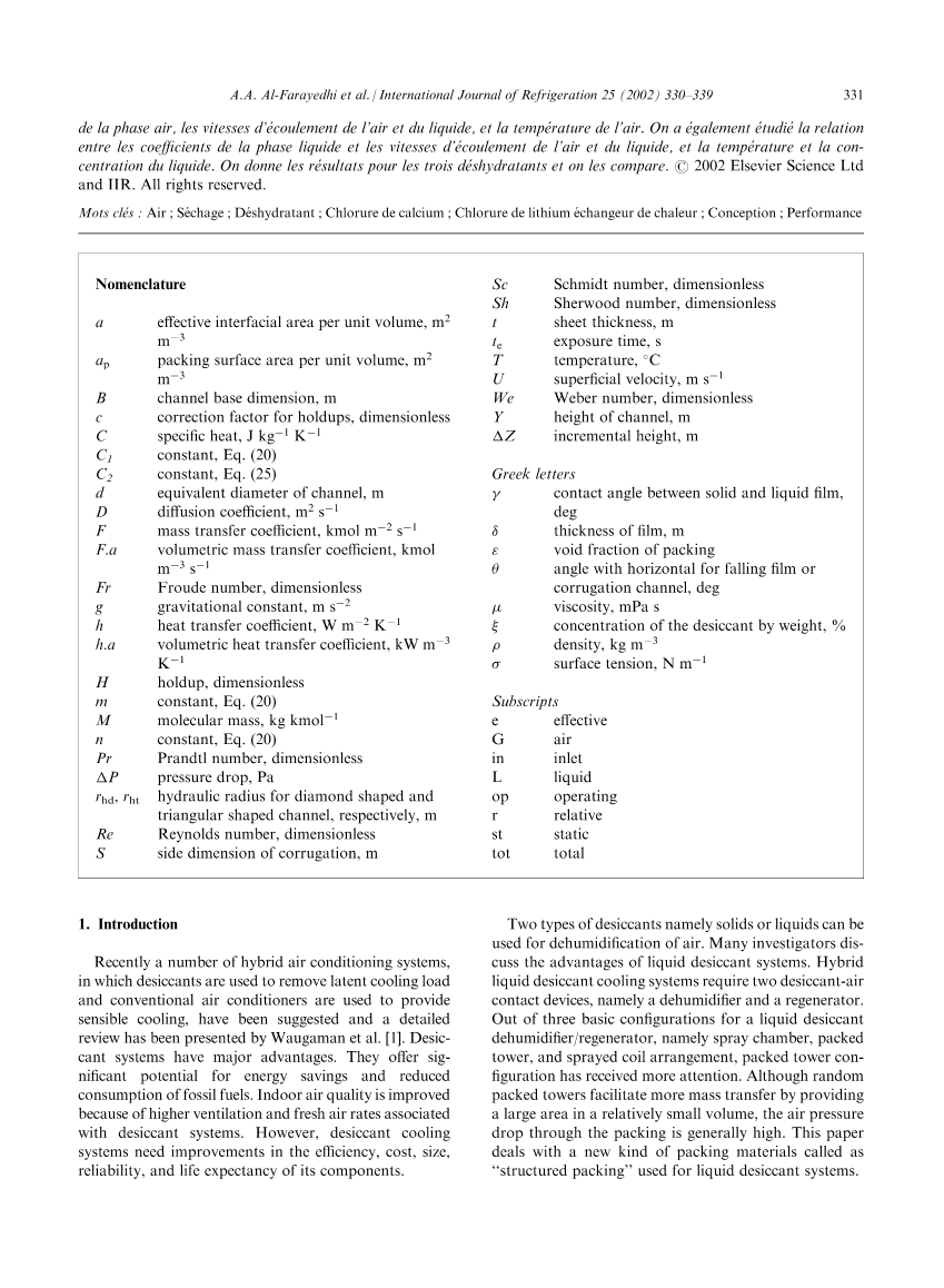 基于散装或规整填料除湿器与再生器的设计需要传质与传递系数等相关参数,但是规整填料塔的相关数据在公开的文献中非常有限。Potnis 和 Lenz等人实验研究了基于太阳能溴化锂溶液除湿系统中Tripack聚丙烯散装填料与Munters CELDEK规整填料在除湿器和再生器中的应用,得到了基于每单元流速的叉流填料床层的局部液相传质系数。这些传质系数与实验测定的扩散系数被用于得到无量纲关系。Chung 等人也实验研究了散装填料(聚丙烯flexi环与鲍尔环)和规整填料(交叉波形纤维素与聚氯乙烯)在氯化锂除湿器中的应用。用Buckingham pi方法可以求出整体气相传热与传质的关系式。以上的关联式总结在表格1中。