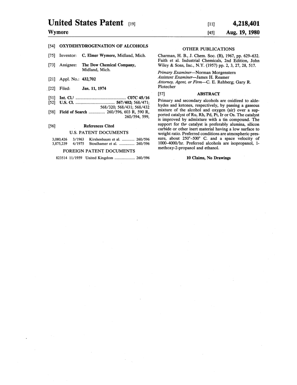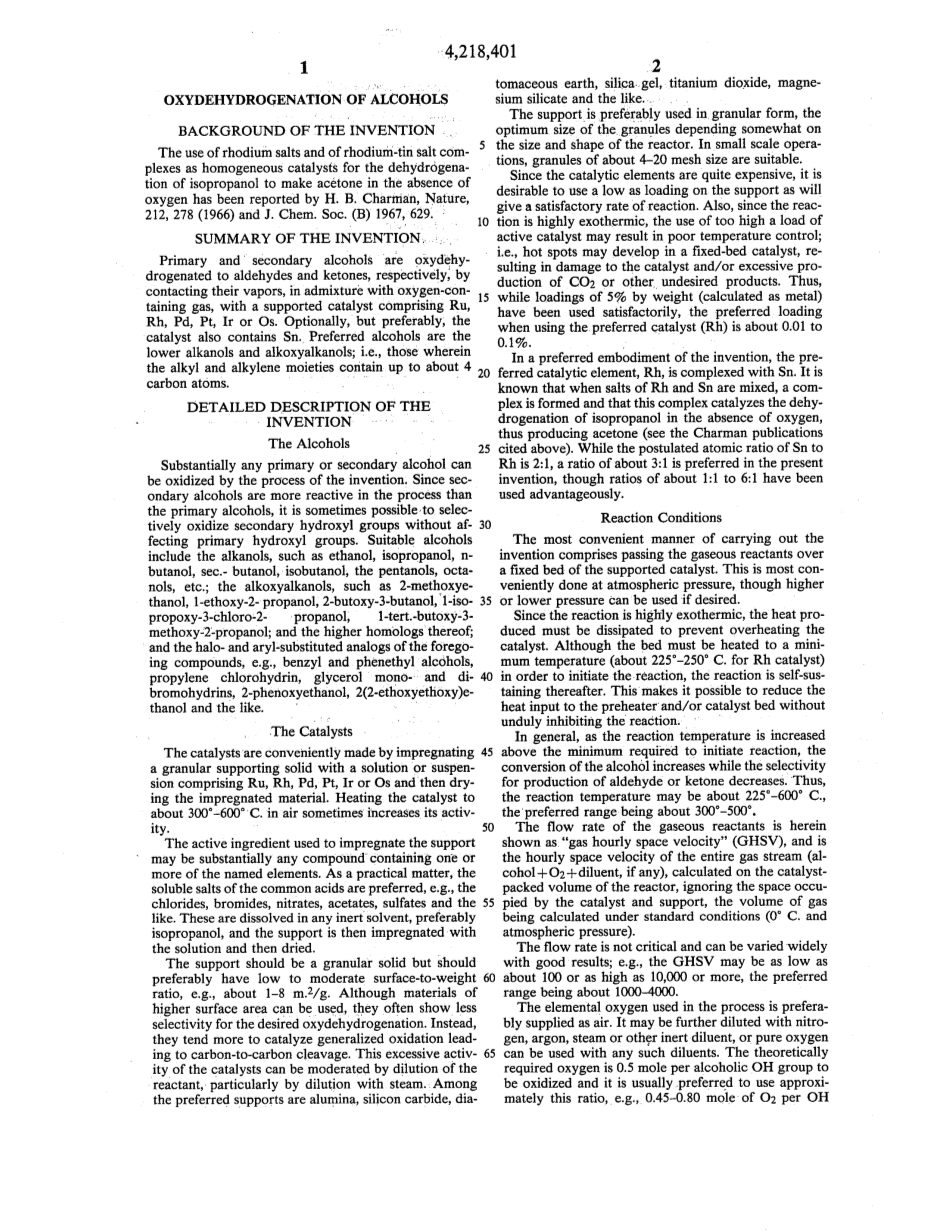 伯醇和仲醇可以被氧化成醛和酮,分别通过与空气中的氧气在含有钌、铑、铅、铂、铱、锇的载体催化剂作用下反应生成。这种催化剂被含锡化合物改进。最好的催化剂载体是氧化铝,碳化硅或其他惰性材料,这些材料具有较低的表面重量比。优先条件是压力在大气压力,温度在约250度-500度,空间速度在每小时1000-4000 。优选的醇有异丙醇、1-甲氧基-2-丙醇和乙醇。