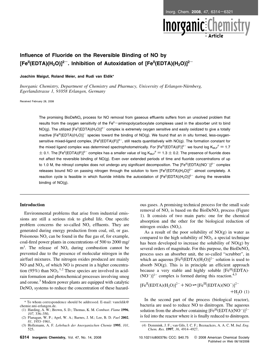 氟化物对[FeII (EDTA)(H2O)]2-对NO的络合吸收的影响以及防止[Fe(EDTA)(H2O)]2-的自动氧化外文翻译资料