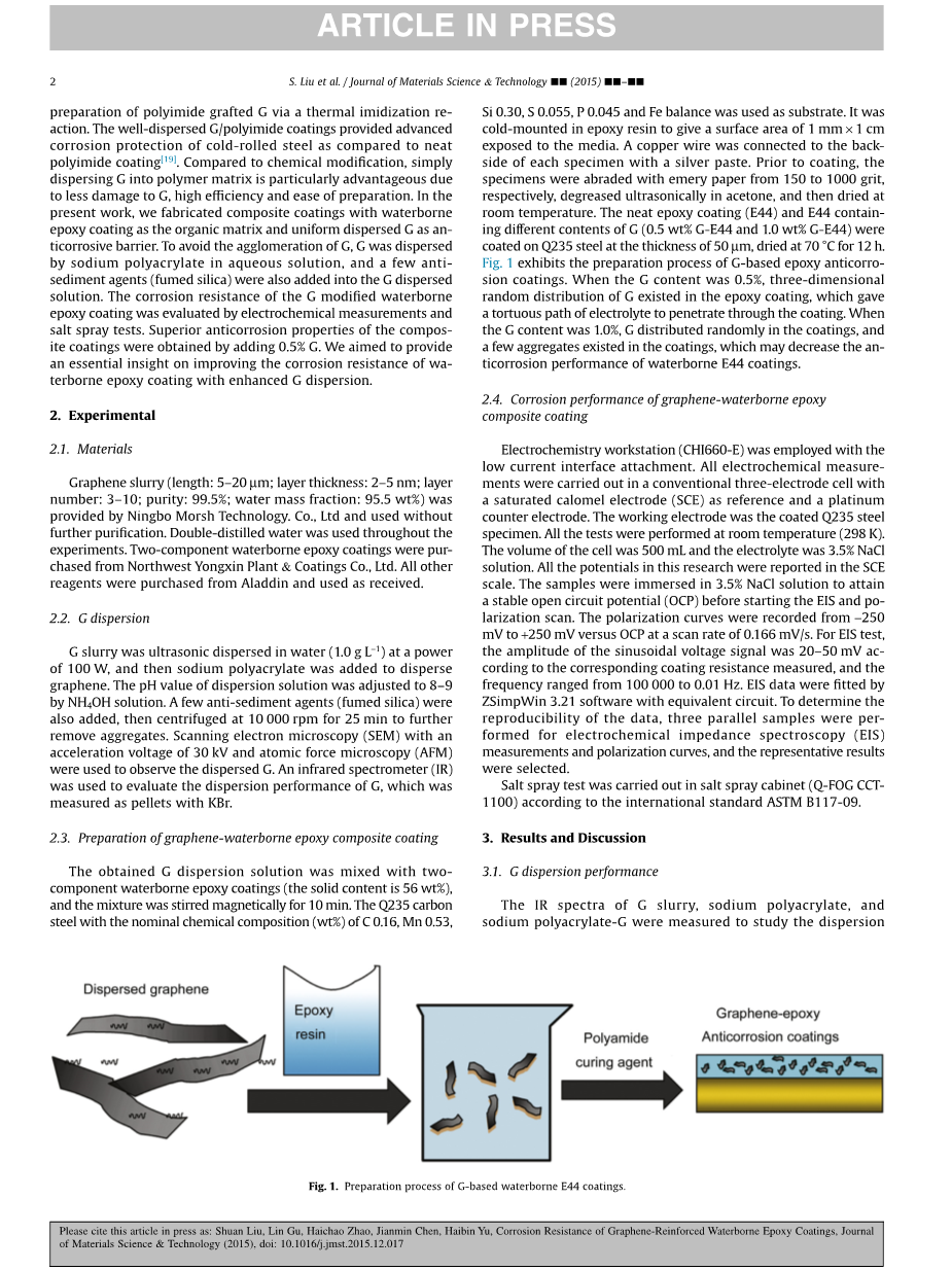 基于G-涂料制造的另一种方法是掺入G薄片进聚合物基质以形成复合涂层,发现能从G的屏障和超疏水性能中获益。然而,G薄片由于其强范德华力和高比表面积,容易聚集在一起,,这使得G在聚合物矩阵[18]中的均匀分散难以实现。很多关于化学改性的方法已经被报道了用来改善G在复合涂层的分散。例如,Chang等人报告了在聚酰亚胺的制备中通过热酰亚胺化反应接枝-G。相比于纯的聚酰亚胺涂层,良好分散的G /聚酰亚胺涂层能提供冷轧钢板更好的的腐蚀保护。相比化学改性,由于对G更小的损伤,高效率和易于制备,单纯分散G成形聚合物基体是特别有利的. 在目前的工作中,我们制造的复合涂层是以水性环氧涂料作为有机基质并将G均匀分散作为防腐屏障。为了避免G的结块,G在水溶液中由聚丙烯酸钠分散,此外,还添加了一些抗沉淀剂(热解法二氧化硅)到G分散液。G改性水性环氧涂料的耐腐蚀性能是通过电化学测量和盐雾试验进行评价。该复合涂层的优异的防腐性能通过加入0.5%G.得到。我们的目的是提供G分散液改善水性环氧涂料耐腐蚀性的必要信息。