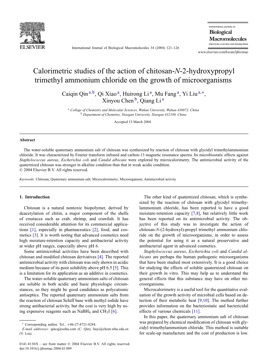 关键词: 壳聚糖;季铵盐;微量热法;微生物;抗菌活性