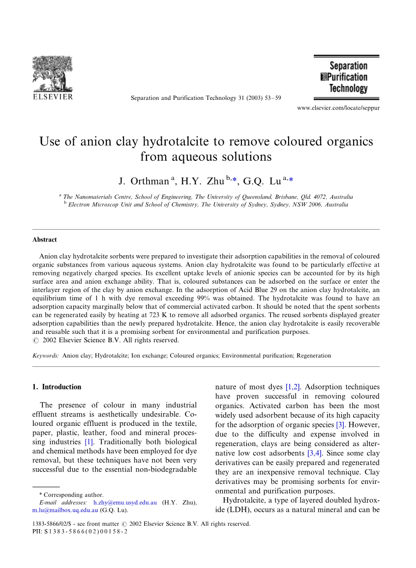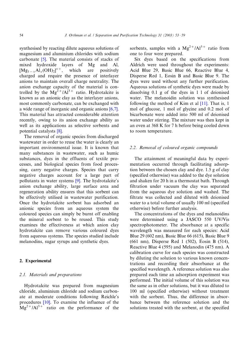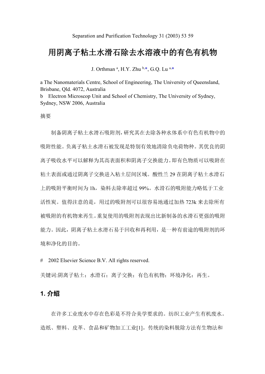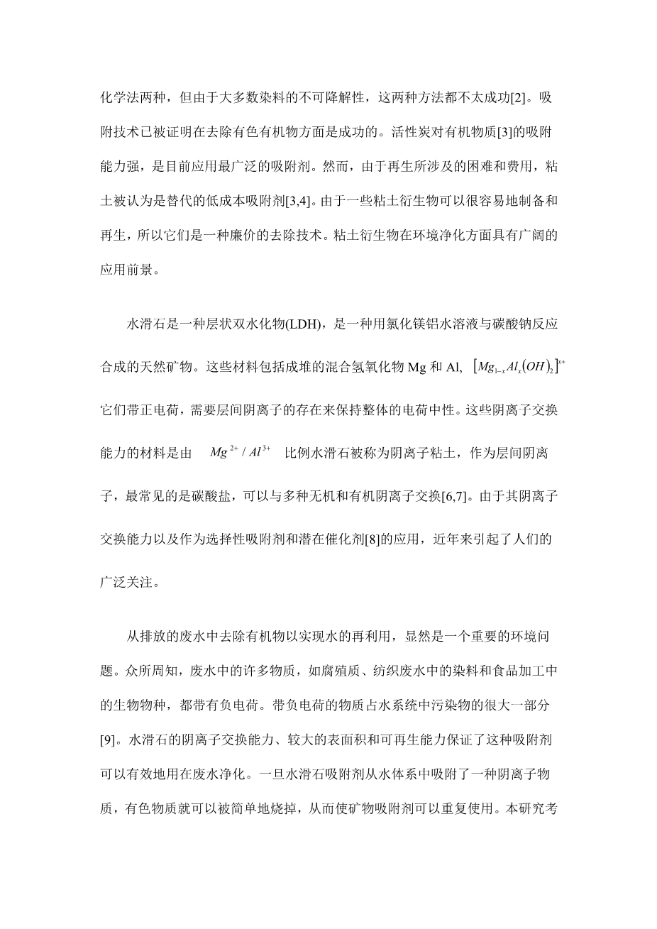 用阴离子粘土水滑石出去水溶液中的有色有机物外文翻译资料
