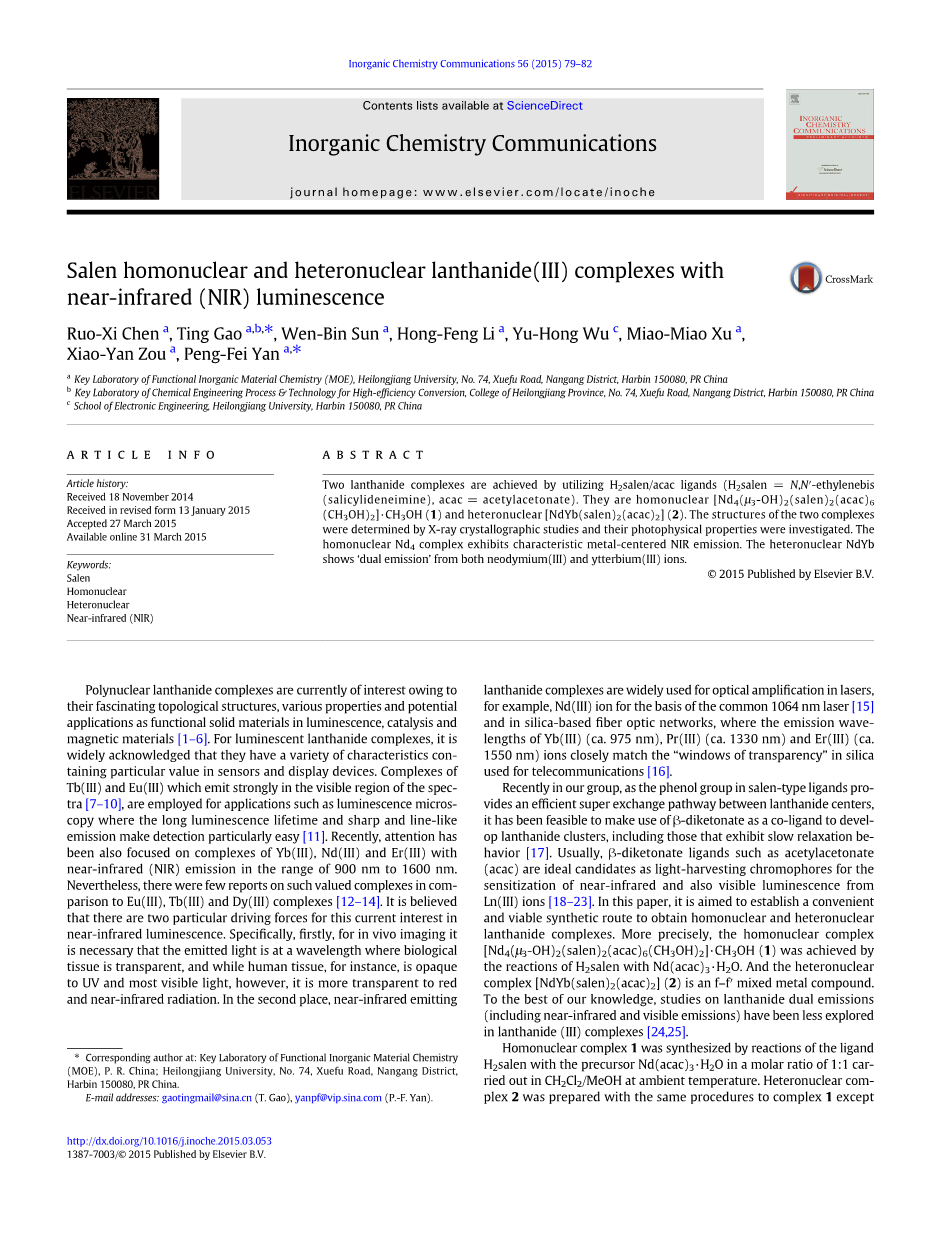 Salen同核和异核镧系(III)配合物具有近红外(NIR)发光的性质Ruo-Xi Chen a, Ting Gao a,b,⁎, Wen-Bin Sun a, Hong-Feng Li a, Yu-Hong Wu c, Miao-Miao Xu a,