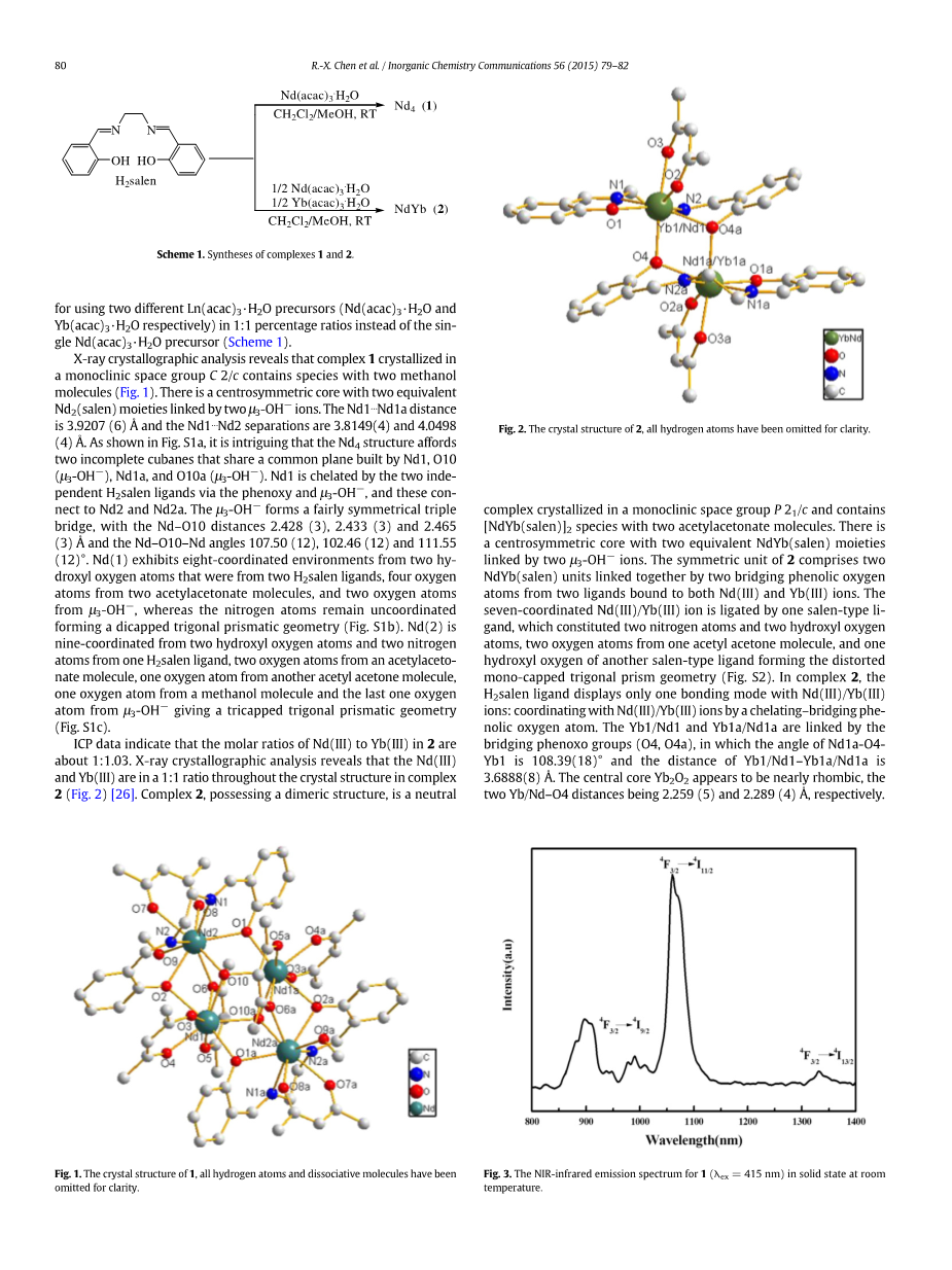 最近,在我们的研究组中,由于salen型配体中的苯酚基团在镧系元素中心之间提供了一种有效的超级交换途径,利用beta;-二酮酸酯作为共配体来开发镧系元素簇是可行的,包括那些表现非常缓慢的现象 [17]。通常,beta;-二酮酸酯配体(例如乙酰丙酮酸酯(acac))是理想的候选光生色团,用于敏化镧(III)离子的近红外光和可见光[18-23]。 本文旨在确定一种方便可行的合成途径,以得到同核和异核镧系元素配合物。更确切地来说,通过H2salen与Nd(acac)3·H2O反应获得了同核络合物[Nd4(mu;3-OH)2(salen)2(acac)6(CH3OH)2]·CH3OH (1)。异核配合物[NdYb(salen)2(acac)2] (2)是f-f混合金属化合物。 据我们所知,在镧系元素(III)配合物中对镧系元素双重排放(包括近红外和可见光排放)的研究较少[24,25]。.