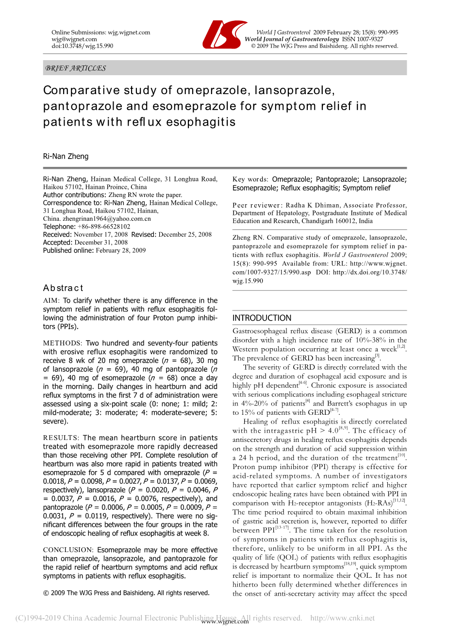 奥美拉唑、兰索拉唑、泮托拉唑、埃索美拉唑对反流性食管炎患者的症状缓解的比较研究外文翻译资料